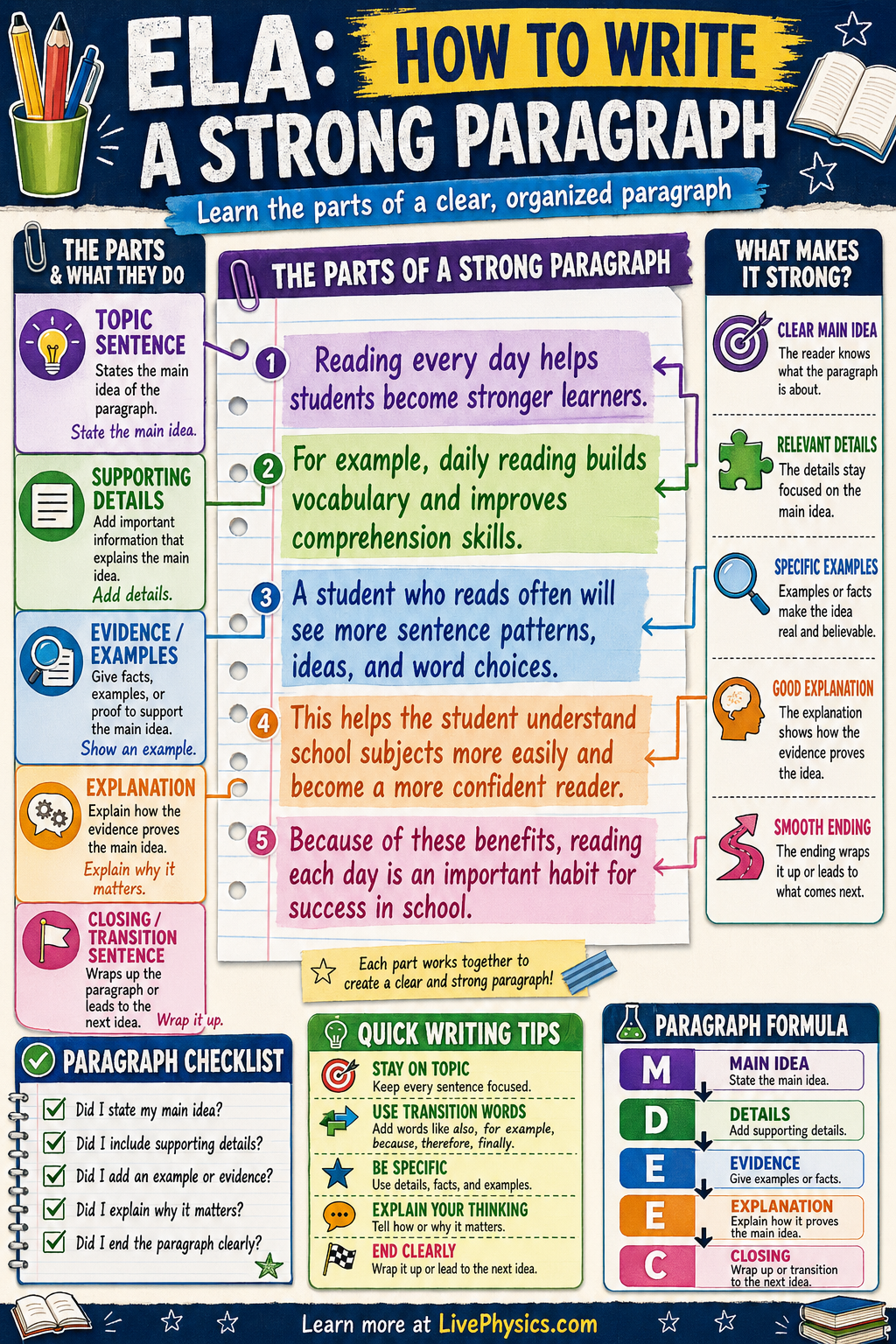 A strong paragraph helps a writer share one clear idea in a way that is easy to follow. Students use strong paragraphs in stories, essays, science responses, and history assignments. When each sentence has a job, the whole paragraph feels organized and convincing. Learning this structure makes writing clearer for both the writer and the reader.