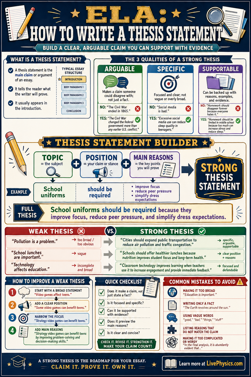 A good thesis is not just a topic or a fact. It combines the subject, the writer's position, and the main reasons that support that position. Strong thesis statements are arguable, specific, and supportable with evidence from texts, facts, or examples. When students learn to build a thesis carefully, they make stronger arguments and write more focused essays.