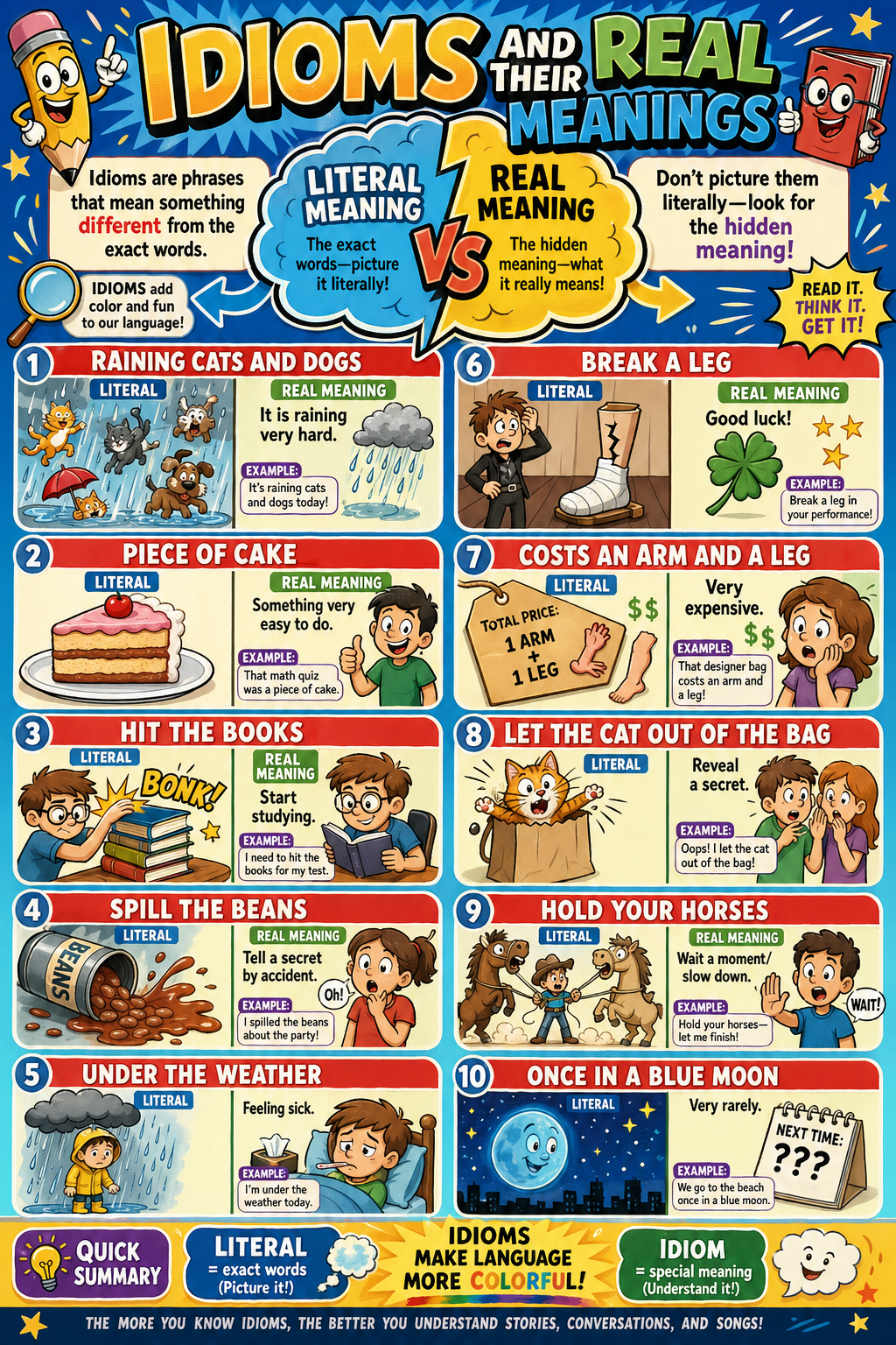 Idioms are phrases that mean something different from the exact words they use. They make speaking and writing more colorful, funny, and expressive. Students hear idioms in books, conversations, songs, and movies all the time. Learning them helps readers understand the real message instead of getting confused by the literal picture.