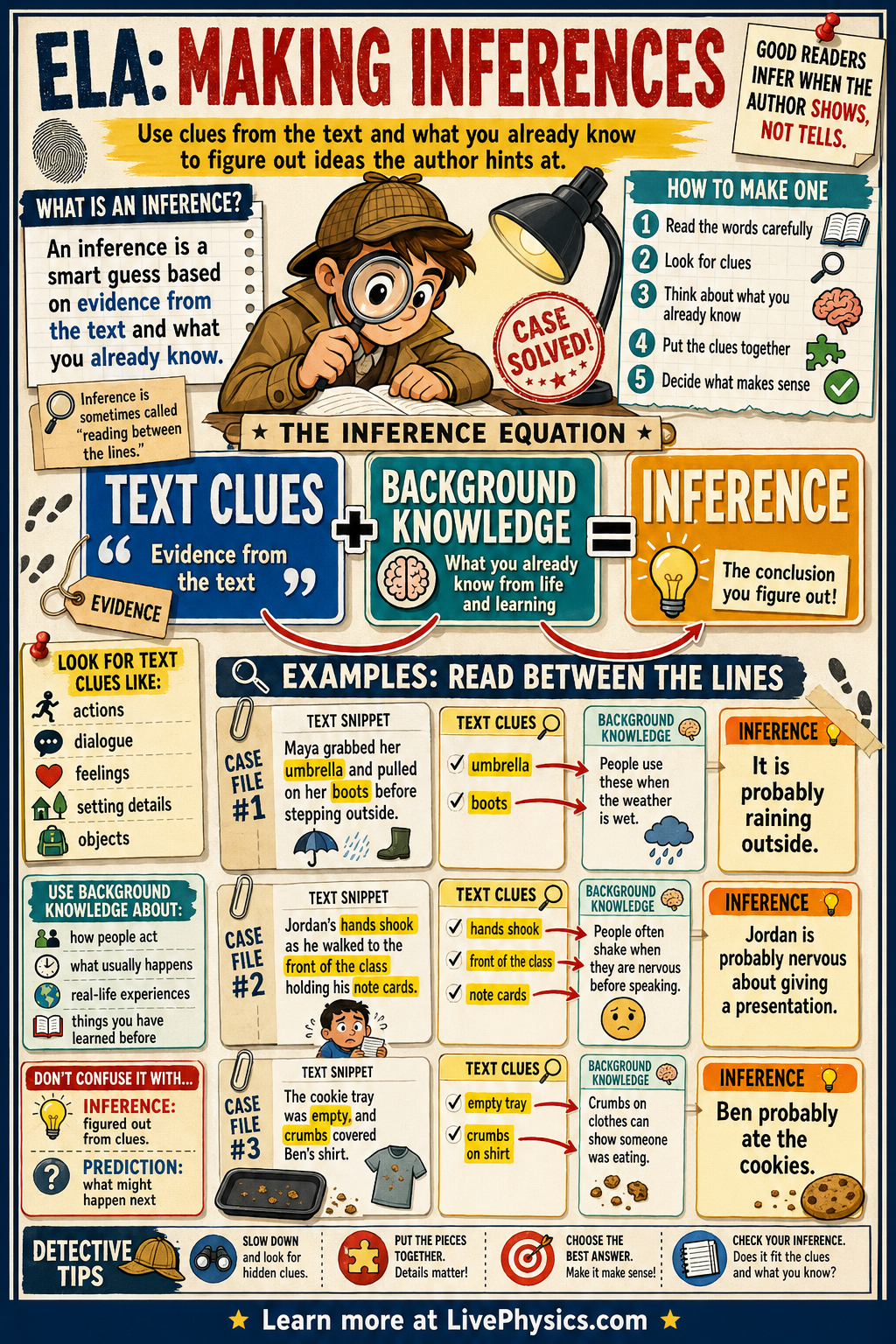 Making an inference means using clues from a text and what you already know to figure out an idea the author does not say directly. This skill helps readers understand characters, settings, and events more deeply. Strong readers make inferences all the time when they read stories, articles, and even poems. It is like being a detective who studies evidence carefully before reaching a conclusion.
