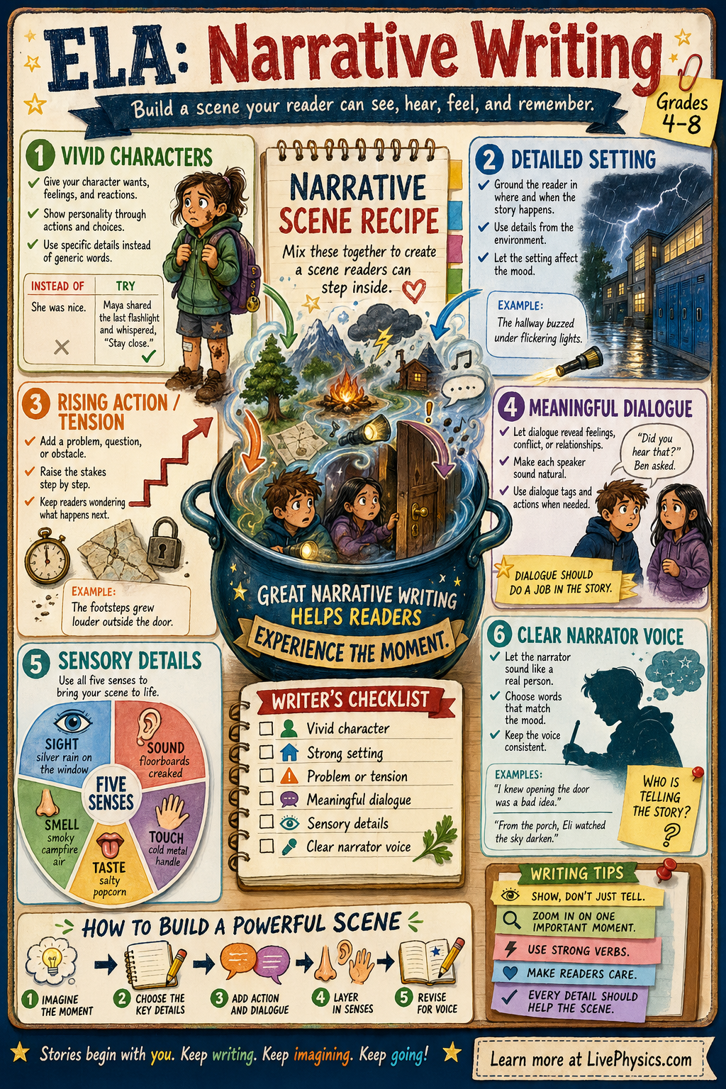 Narrative writing helps readers step into a story and experience events as if they are there. A strong narrative scene is more than just telling what happened. It combines characters, setting, action, dialogue, and details to create a moment that feels real and interesting. Learning how these parts work together helps students write stories that are clear, vivid, and memorable.