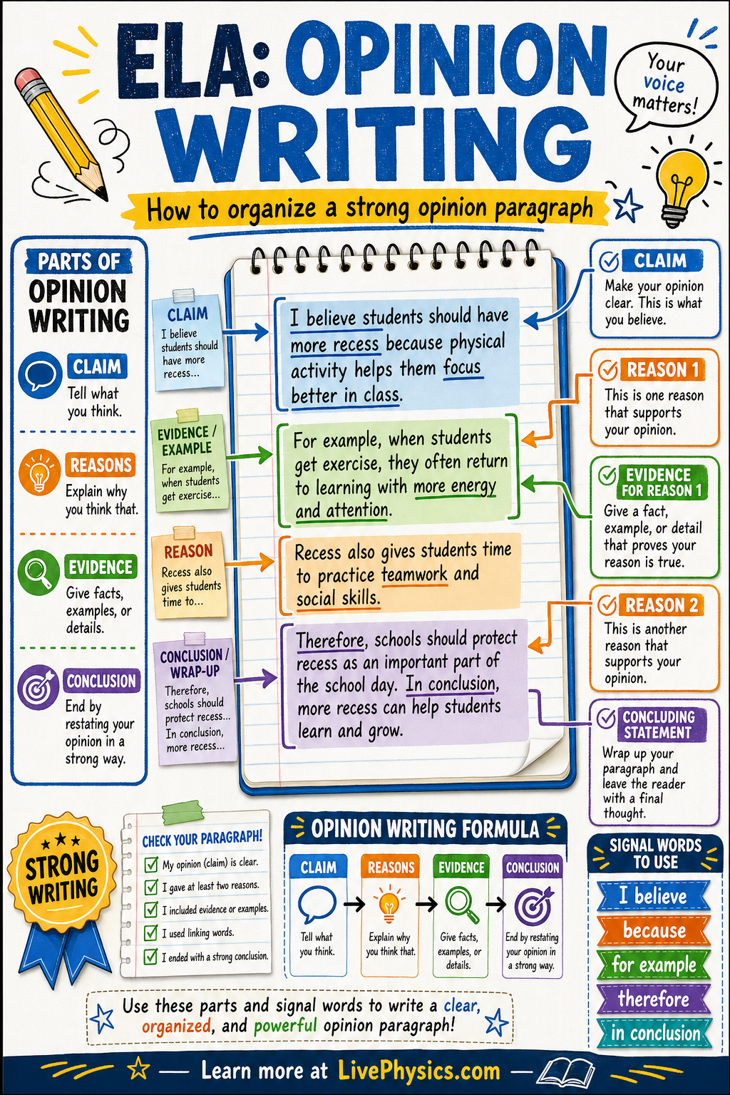 A strong opinion paragraph usually includes four main parts: a claim, reasons, evidence, and a concluding statement. The claim tells your opinion, the reasons explain why you think that way, and the evidence gives facts, details, or examples to support each reason. Signal words such as I believe, because, for example, therefore, and in conclusion help readers follow your ideas. When these parts work together, the writing sounds organized, convincing, and complete.