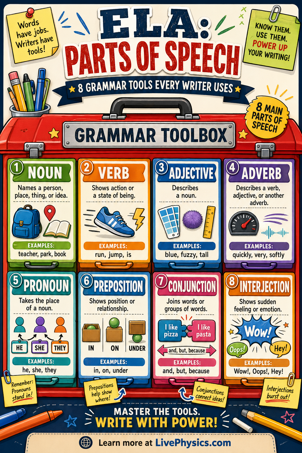 The eight parts of speech work together like tools in a toolbox. Nouns name people, places, things, or ideas, while verbs show action or a state of being. Adjectives and adverbs add detail, and pronouns replace nouns to avoid repetition. Prepositions, conjunctions, and interjections help connect ideas, show relationships, and express feeling.