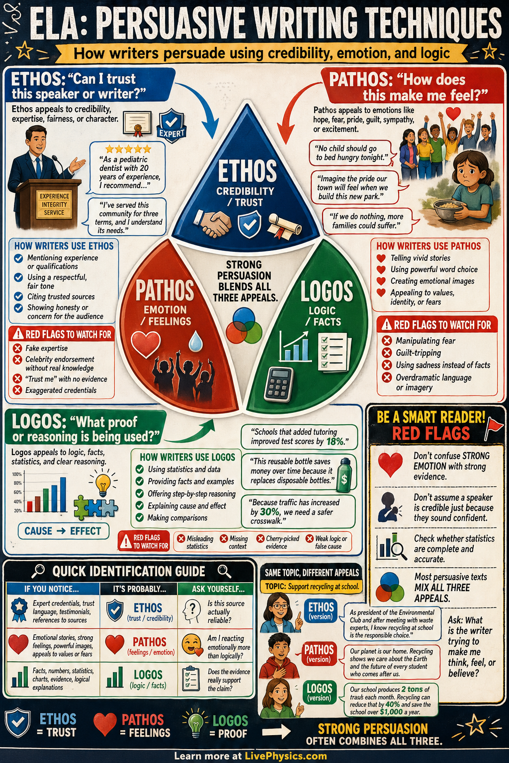 A classic way to understand persuasion is through ethos, pathos, and logos. Ethos builds trust by showing the writer or speaker is credible, fair, or knowledgeable. Pathos appeals to emotions such as hope, fear, pride, or sympathy. Logos uses reasons, facts, examples, and evidence to support a claim, and the strongest arguments usually combine all three appeals.