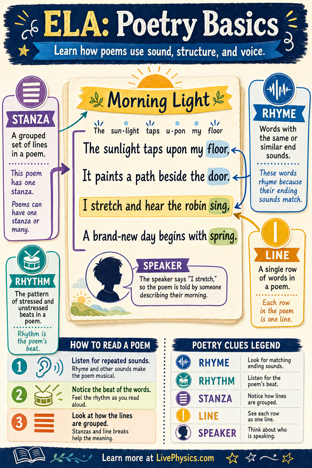Poetry is a special kind of writing that uses sound, rhythm, and word choice to create meaning and feeling. Unlike regular paragraphs, poems are often arranged in lines and stanzas that help shape how the reader hears the words. Learning basic poetry terms helps students notice patterns and understand how a poem works. These skills also make reading and writing poems more enjoyable.