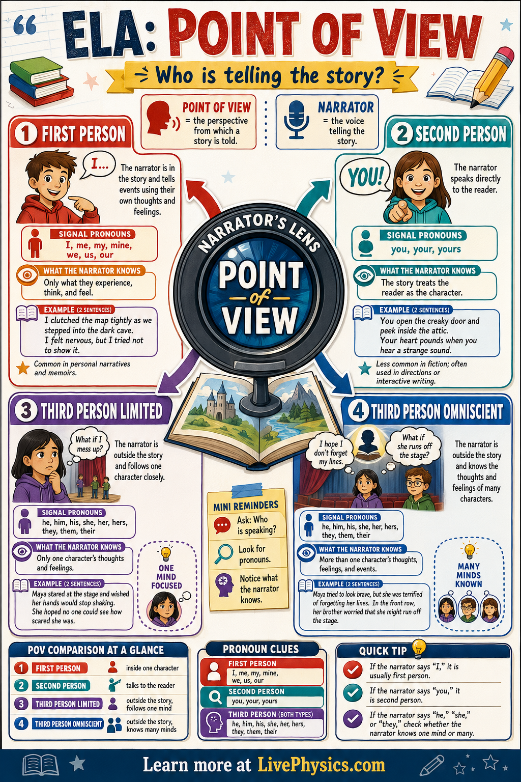 Point of view is the perspective from which a story is told. It helps readers understand who is speaking, what that speaker knows, and how events are described. Learning point of view makes it easier to follow a text and explain how a narrator shapes the story. It also helps students become stronger readers and writers.