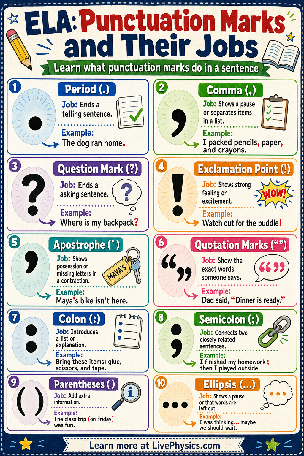 Punctuation marks are small symbols that do big jobs in writing. They help readers know when to stop, pause, ask a question, show excitement, or connect ideas. Learning what each mark does makes sentences clearer and easier to understand. Strong punctuation also helps your writing sound the way you want it to sound.