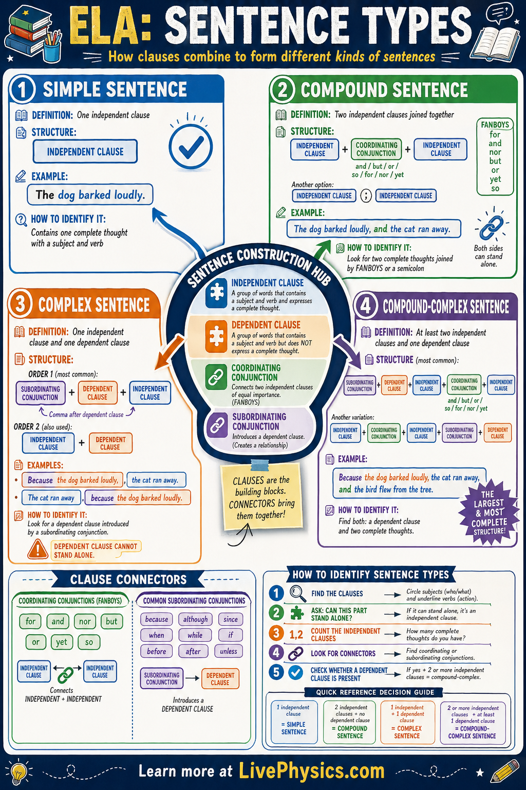 An independent clause can stand alone as a complete sentence, while a dependent clause cannot stand alone. Writers connect clauses with punctuation and connector words such as coordinating conjunctions and subordinating conjunctions. Learning to spot these parts makes it easier to identify sentence types quickly. It also helps students avoid fragments, run-ons, and confusing sentence structure.
