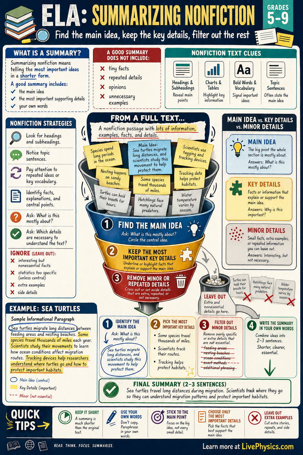 Summarizing nonfiction means shrinking a text down to its most important ideas without changing the meaning. This skill helps students understand textbooks, articles, science passages, and history readings more clearly. A strong summary tells what the text is mostly about and includes only the key details that support that main idea. It leaves out extra examples, repeated facts, and small details that are not essential.