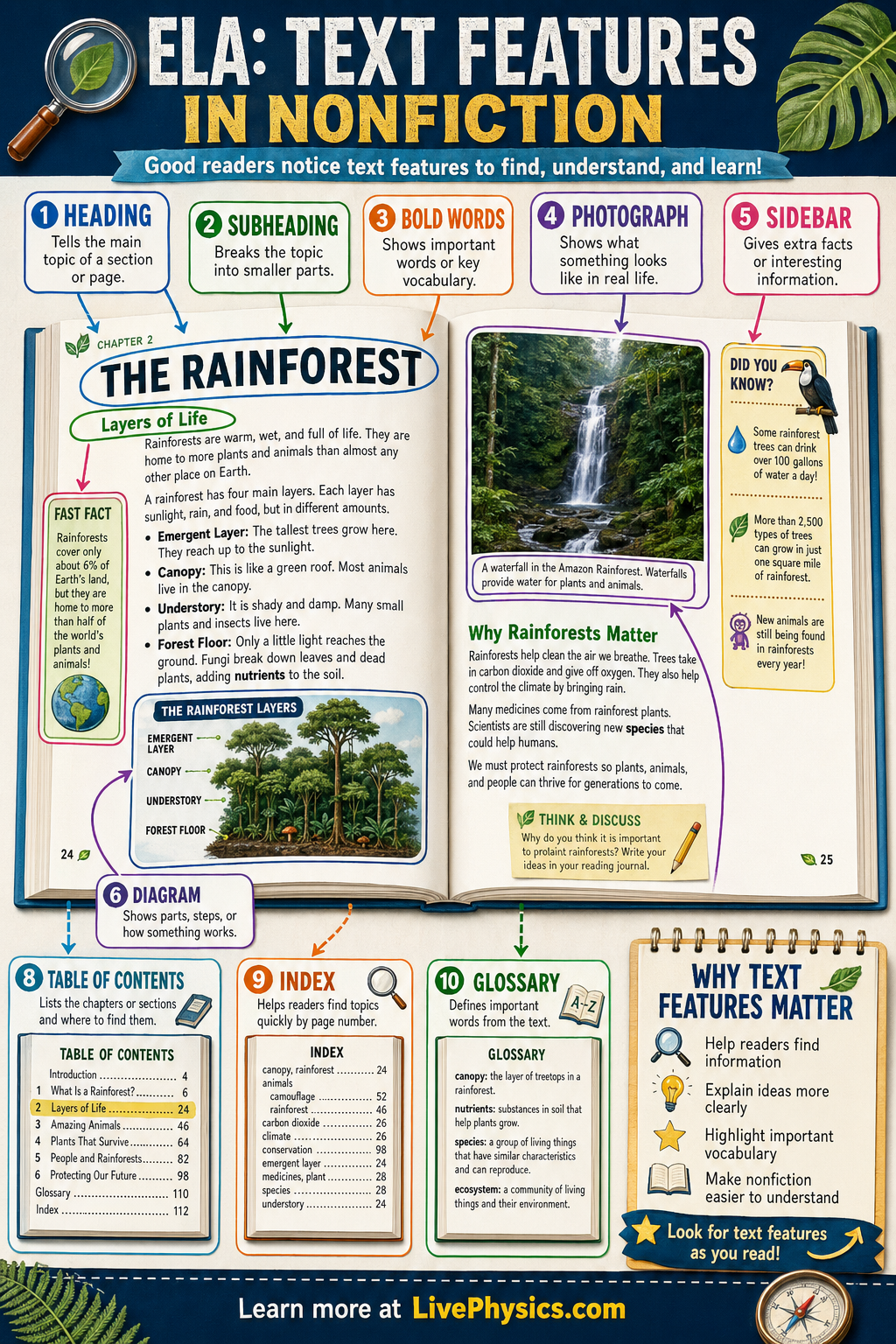 Nonfiction text features are tools authors use to help readers find information, understand ideas, and learn new words. These features make informational texts easier to read than a long block of plain paragraphs. When students notice headings, captions, diagrams, and other features, they can read with a clear purpose. Learning these features helps readers study better in science, social studies, and other subjects.