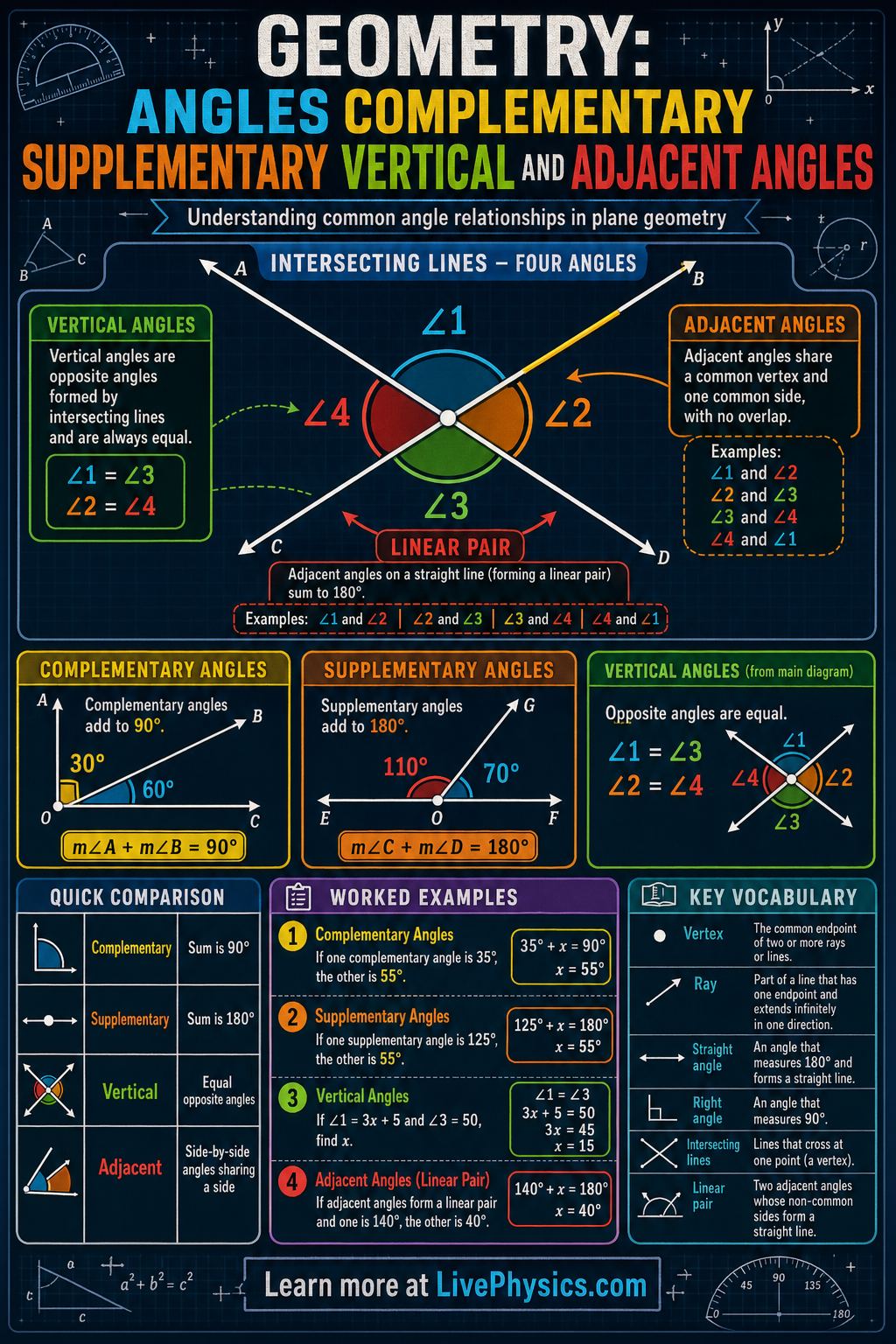 Angles describe how two rays or lines open relative to each other, and they appear everywhere in geometry, engineering, and design. Learning the relationships between angle pairs helps students solve unknown measures quickly and recognize patterns in diagrams. Complementary, supplementary, vertical, and adjacent angles are some of the most common angle relationships in algebra and geometry problems. Understanding them builds a foundation for proofs, equations, and real world measurement.