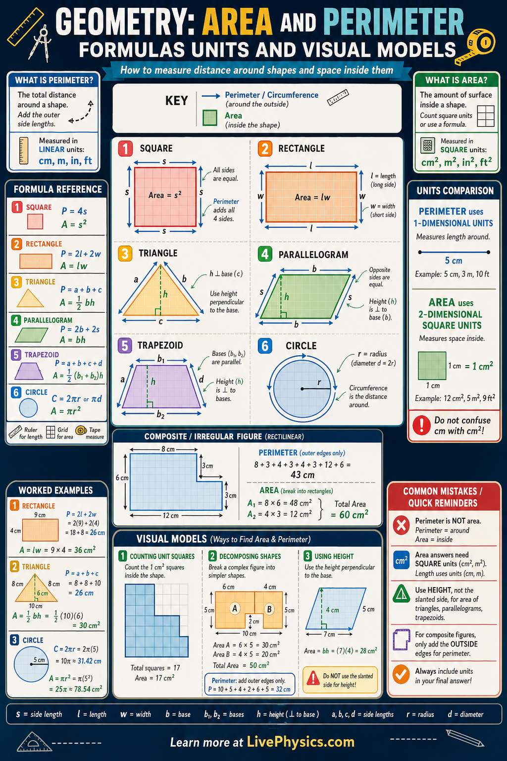Visual models make these formulas easier to understand because they show where each formula comes from. A perimeter model traces the outer edges, while an area model often breaks a shape into rectangles or triangles that can be counted or rearranged. Units also matter because perimeter uses linear units like cm or m, but area uses square units like cm^2 or m^2. When students connect formulas, units, and diagrams, geometry becomes more logical and less about memorizing rules.