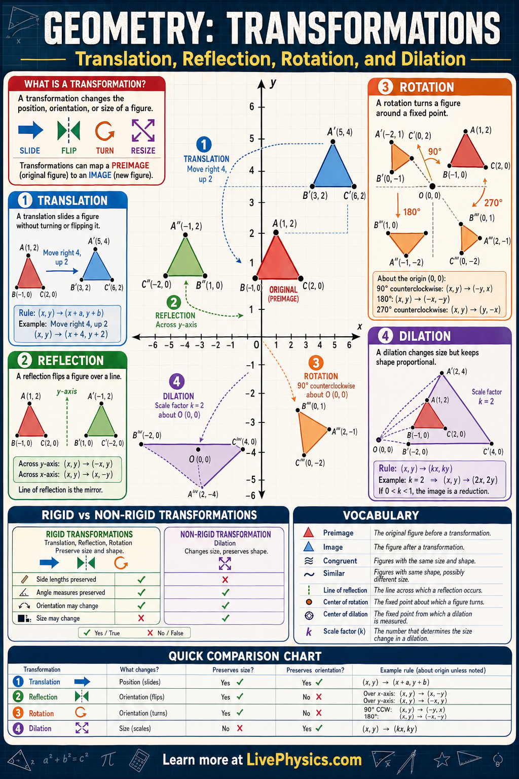 The four main transformations are translation, reflection, rotation, and dilation. A translation slides a figure, a reflection flips it across a line, a rotation turns it around a point, and a dilation changes its size by a scale factor. Each transformation follows a rule that maps original coordinates to new coordinates. By learning these rules, students can sketch images quickly and check whether a transformation preserves length, angle measure, orientation, or size.