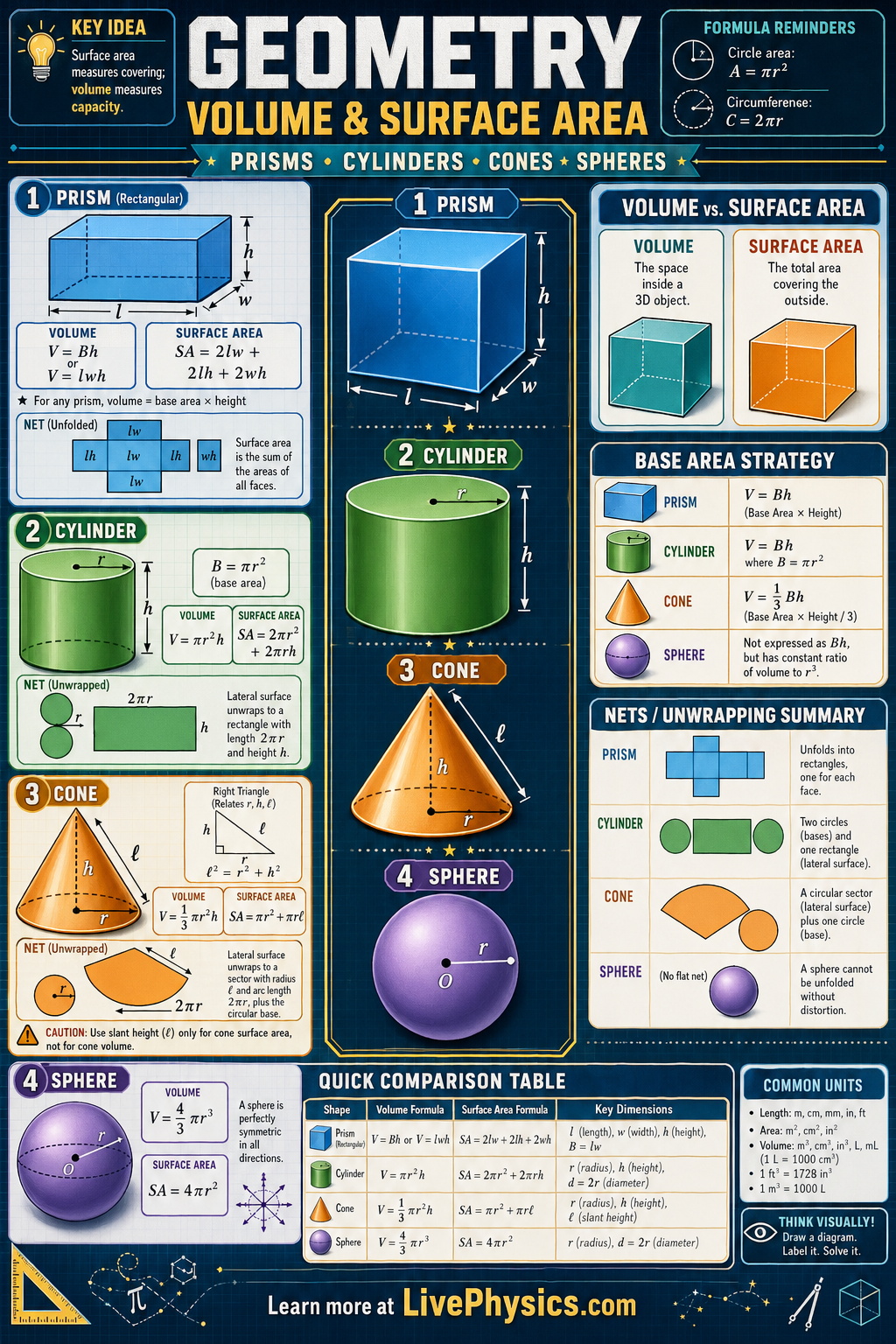 Each solid has a different structure, so its formulas come from different geometric ideas. Volume measures the amount of space inside, usually in cubic units, while surface area measures the total area of all outer faces or curved surfaces, usually in square units. Prisms and cylinders have matching cross sections along their length, while cones and spheres involve curved geometry. Understanding which dimensions to use, such as radius, height, and slant height, is the key to solving problems correctly.