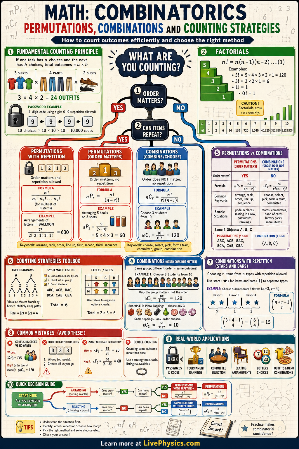 The core idea is to match each situation to the right strategy. If order matters, you often use permutations, and if order does not matter, you often use combinations. For multi step processes, the multiplication principle and counting trees help organize outcomes clearly. Factorials, restrictions, and repeated objects add important variations, so careful interpretation of the problem is just as important as the formula.