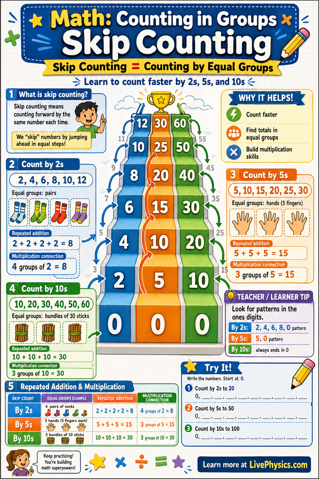 Skip counting means counting forward by the same amount each time instead of by ones. It helps students see patterns in numbers and understand equal groups. This skill is important for addition, multiplication, telling time, and working with money. Learning to skip count builds number sense and makes larger counts faster and easier.