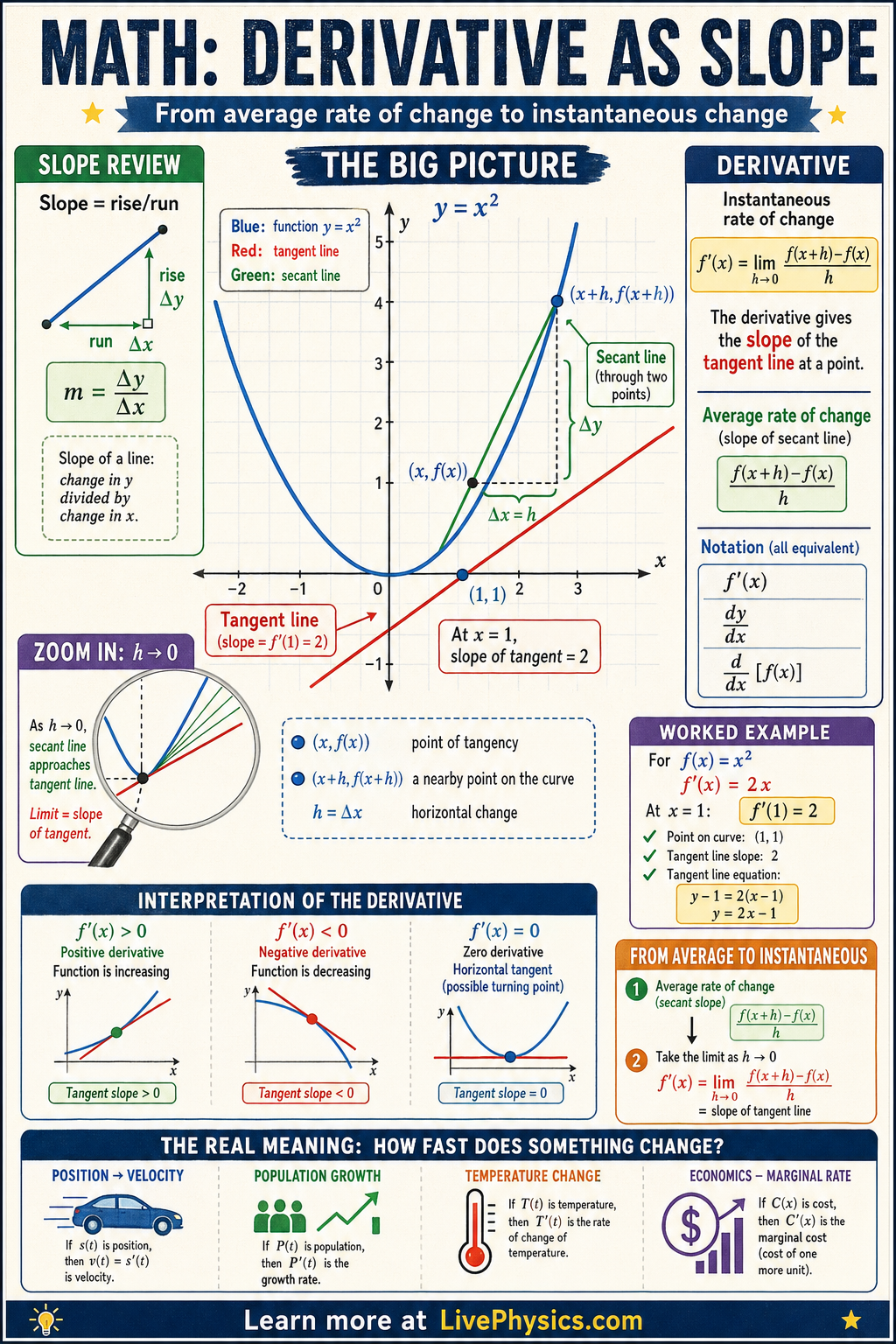 The derivative of a function at a point measures its instantaneous rate of change — the slope of the tangent line at that point. It is defined as a limit: f'(x) = lim[h→0] (f(x+h) − f(x))/h. This expression is the slope of a secant line (connecting two points on the curve) as the two points get infinitely close together. When the limit exists, the function is differentiable at that point and the derivative gives the exact slope of the curve at that instant.