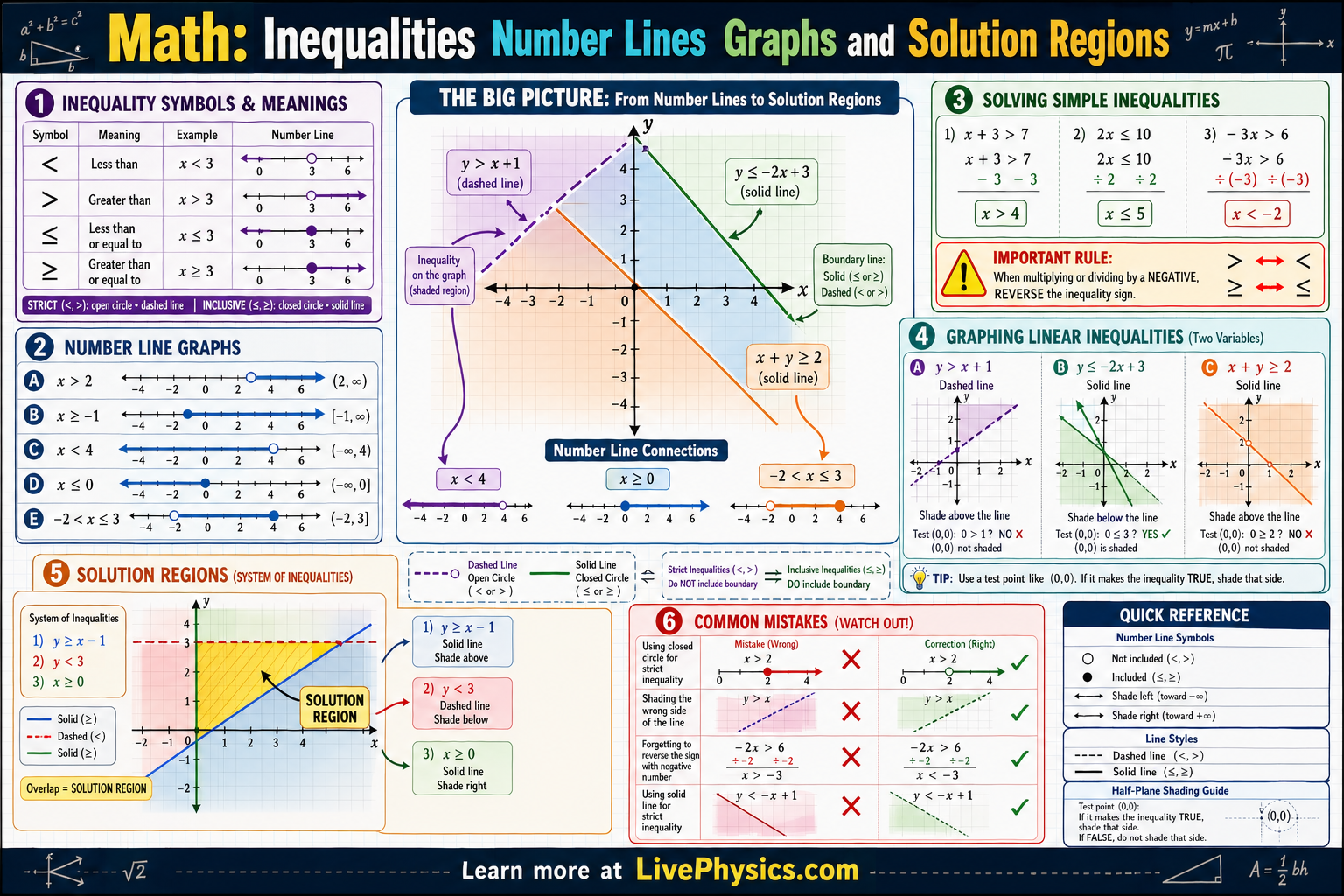 - Forgetting to reverse the inequality sign after multiplying or dividing by a negative number, which gives the opposite solution. For example, from -2x > 6, the correct result is x < -3.
