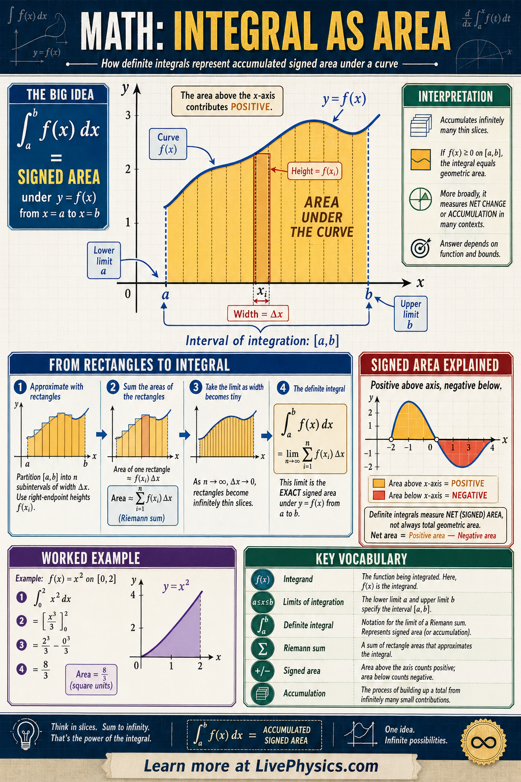 - Definite integral = signed area under curve; negative where f(x) < 0