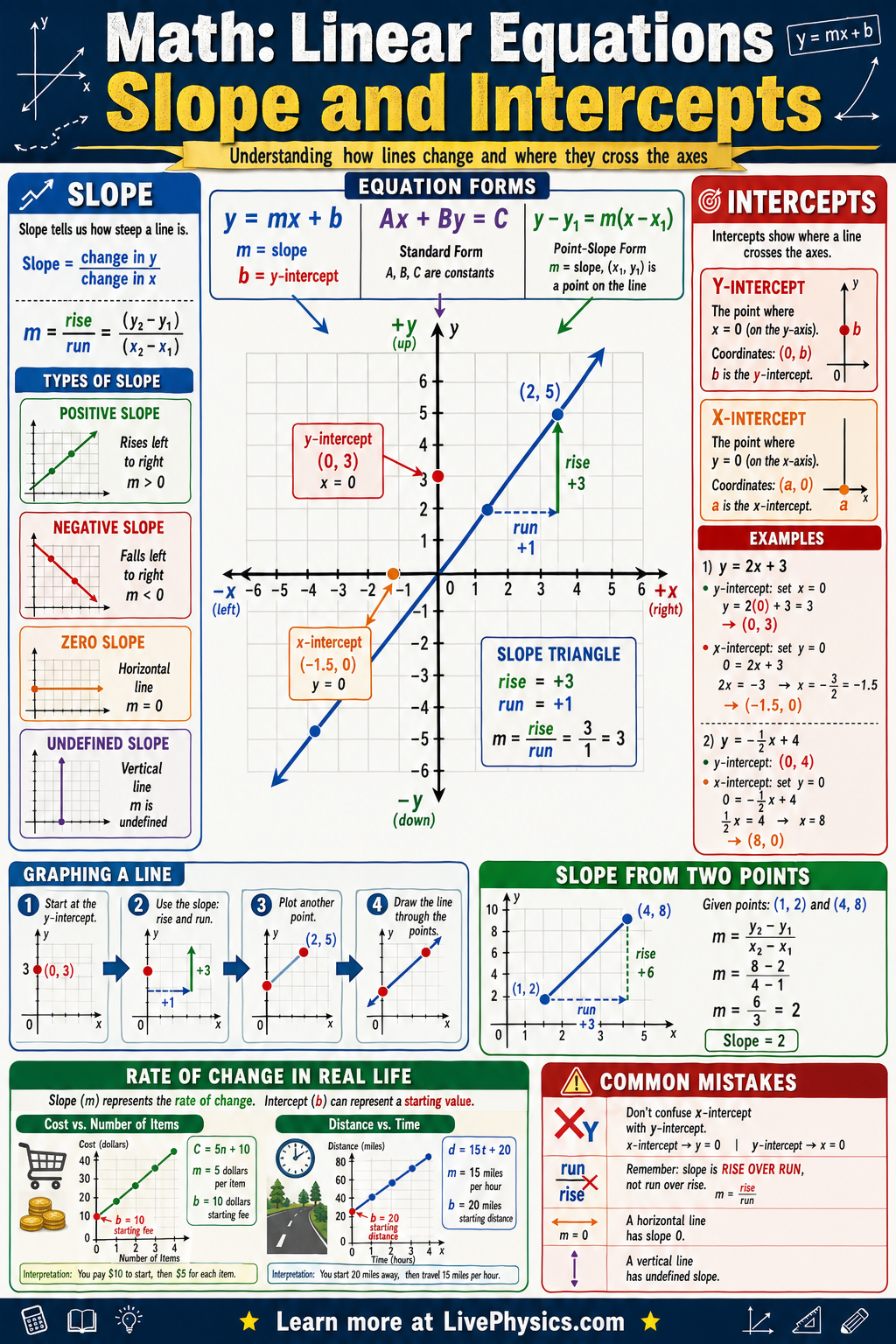 - Slope measures rate of change: m = rise/run = (y2 - y1)/(x2 - x1)