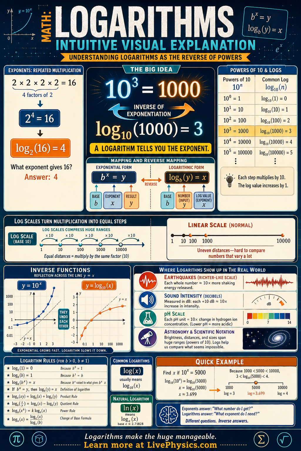 Logarithms give a compact way to describe very large or very small numbers by focusing on exponents instead of raw size. They answer a simple question: what power of a base produces a given number? This idea matters in algebra, science, and engineering because many real systems grow, shrink, or are measured exponentially. Once students connect logs to exponents, many formulas become easier to interpret.