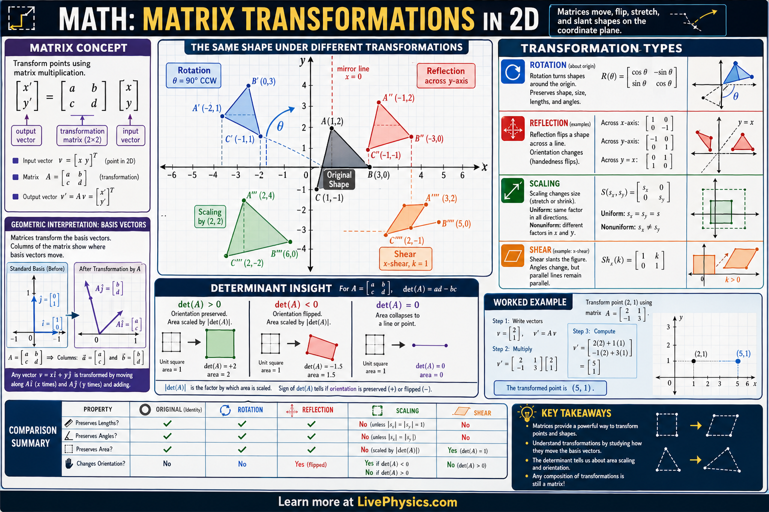 - Determinant = area scaling factor; det = 0 means the transformation collapses to a lower dimension