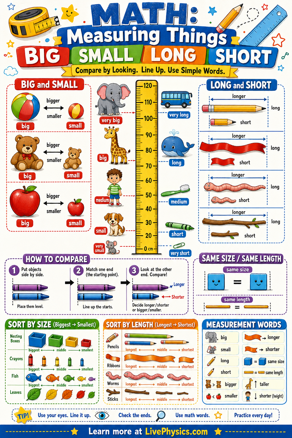 Measurement helps us compare the world around us in a clear and consistent way. We use it to describe how big or small something is and how long or short it is. In math, measurement gives numbers to these comparisons so we can sort, estimate, and solve problems. It is useful in everyday tasks like building, cooking, traveling, and organizing objects.