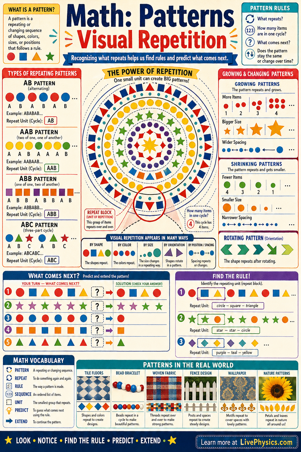 Patterns are repeated arrangements that help us describe order in math and in the world around us. Visual repetition appears in floor tiles, fabrics, art, architecture, and graphs. By studying how shapes, colors, and positions repeat, students learn to predict what comes next and describe structure clearly. This idea connects geometry, algebra, and symmetry in one visual system.