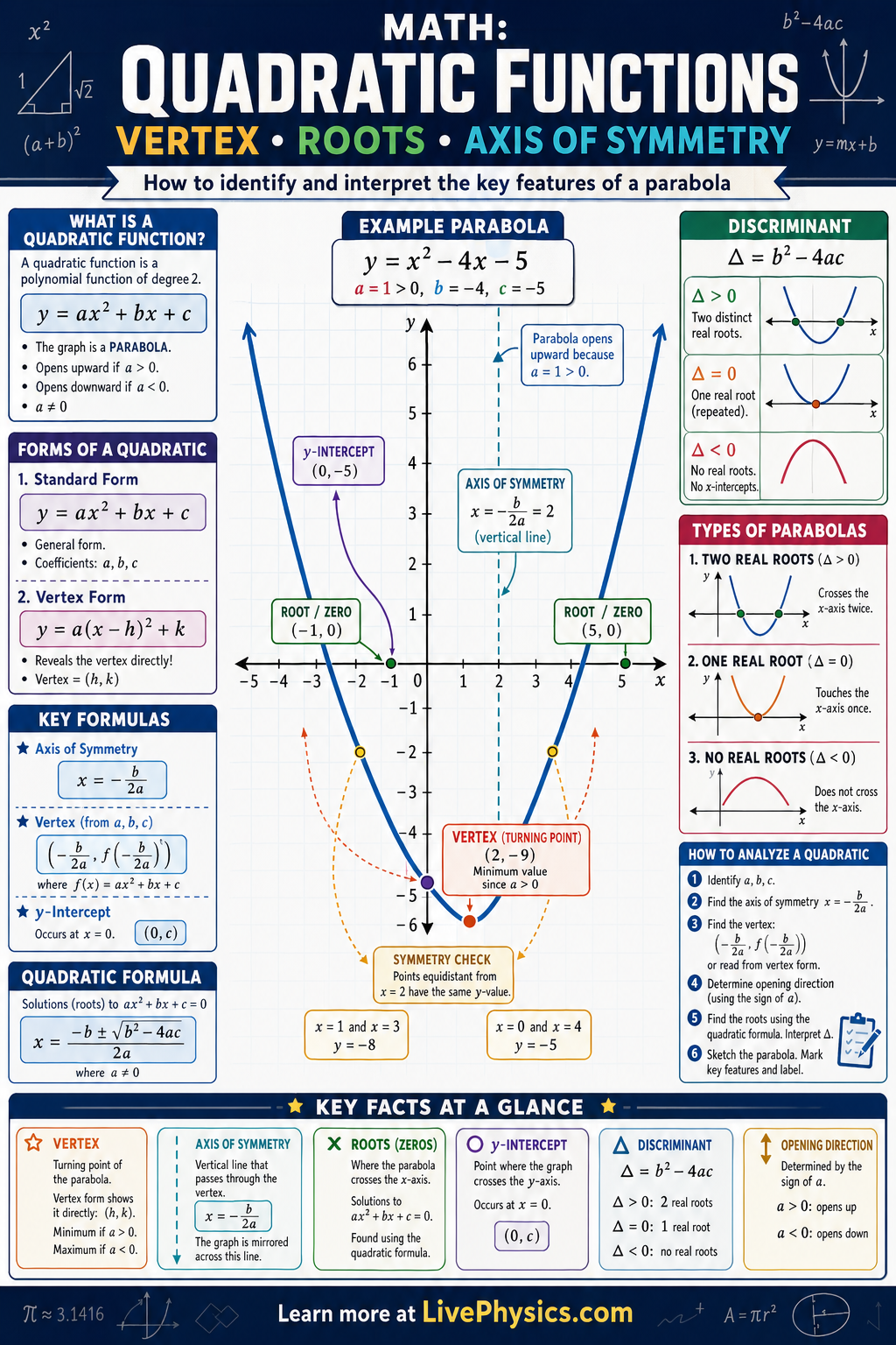 A quadratic function is often written as y = ax^2 + bx + c, where the value of a controls whether the parabola opens up or down and how wide it appears. The vertex gives the maximum or minimum point, the roots show where the graph crosses the x-axis, and the axis of symmetry splits the parabola into two mirror-image halves. These features are connected by formulas, so once you know some of them, you can often find the others quickly.