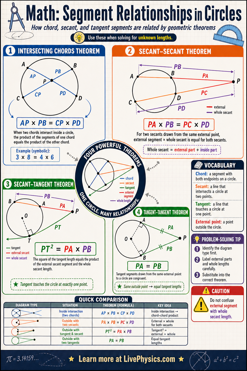Segment relationships in circles connect geometry diagrams to exact equations for missing lengths. These theorems help students solve problems involving chords, secants, and tangents without measuring directly. They are important because many circle problems look different on the surface but follow the same small set of patterns. Learning to identify the pattern is the key step in solving them correctly.