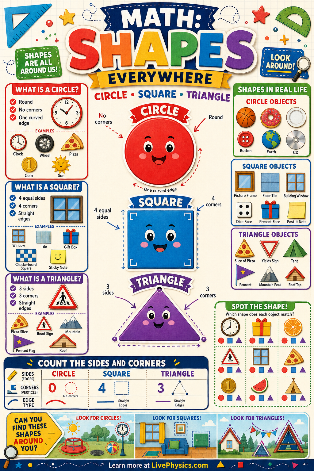 Shapes are one of the first big ideas in math because they help us describe the world around us. A clock face is a circle, a window can be a square, and a roof often looks like a triangle. Learning to recognize shapes builds observation skills, spatial reasoning, and early geometry understanding. These ideas also support drawing, building, measuring, and problem solving.