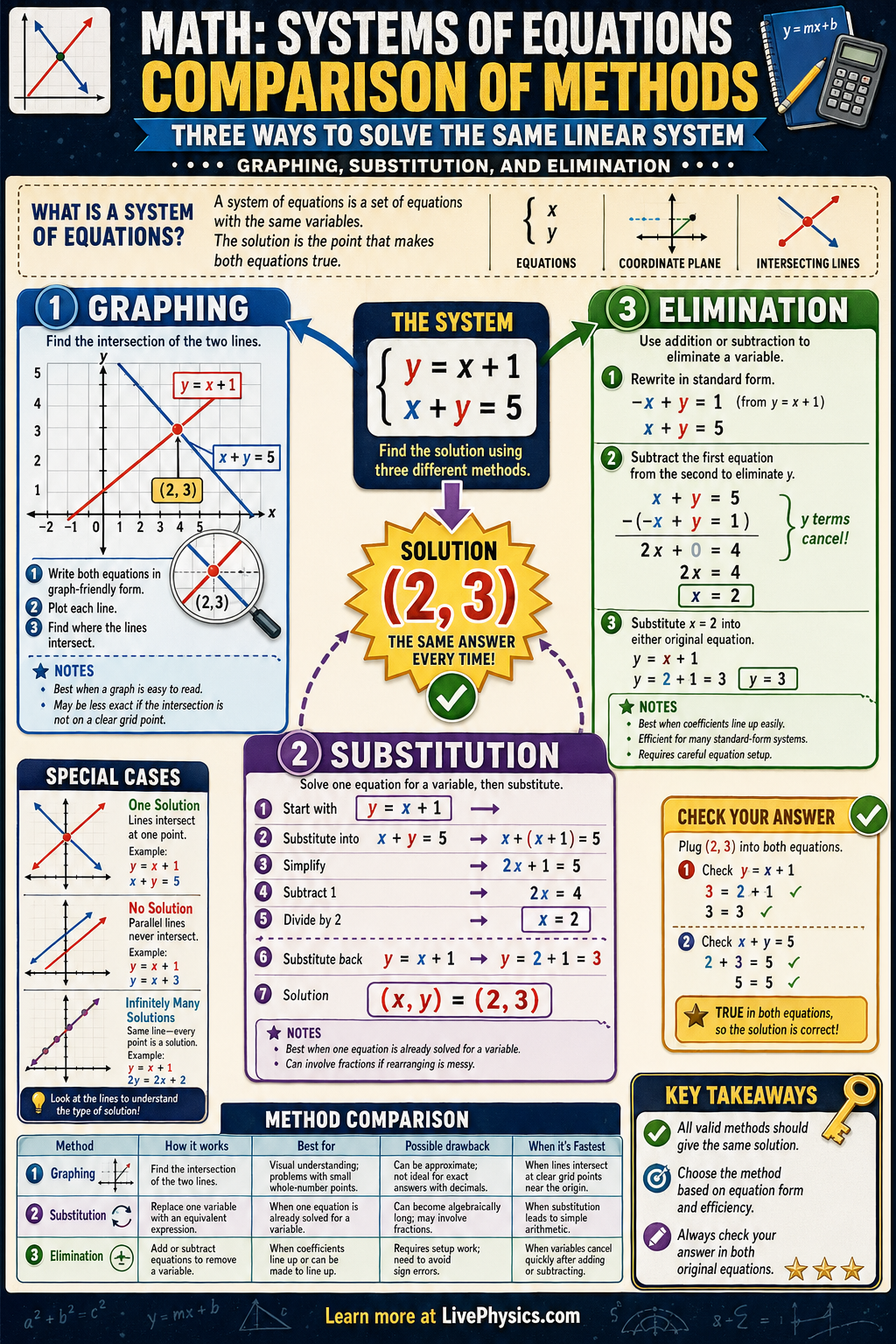 A system of equations is a set of two or more equations that share the same variables. Solving the system means finding values that make all equations true at the same time. Students study systems because they model real situations with multiple conditions, such as cost and quantity or distance and time. Comparing methods helps you choose the fastest and clearest strategy for a given problem.