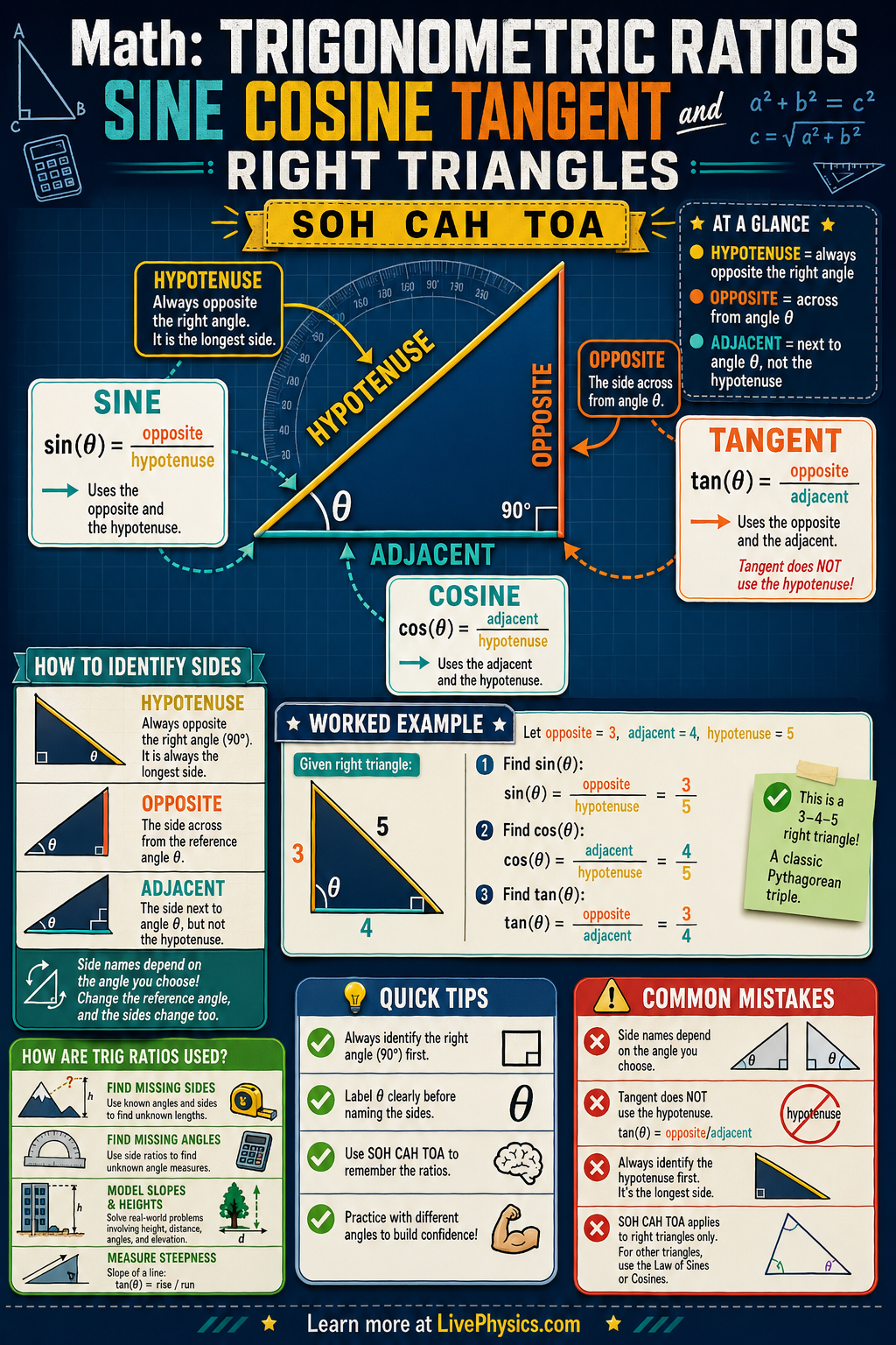 - Mixing up opposite and adjacent, because these names depend on the chosen acute angle. Always identify the reference angle first, then label sides relative to that angle.