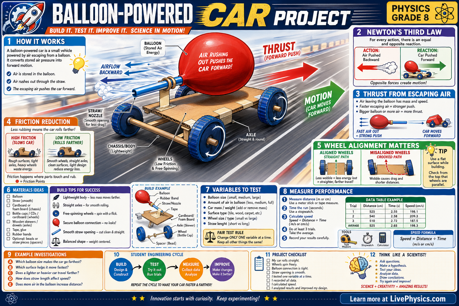 A balloon powered car is a simple project that shows how forces cause motion. When air rushes out of the balloon in one direction, the car moves in the opposite direction. This makes the project a clear example of Newton's third law of motion. It also helps students connect science ideas to a real design challenge.