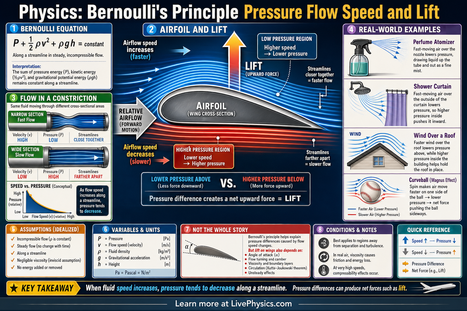 For steady flow of an ideal fluid, Bernoulli's equation says that pressure energy, kinetic energy, and gravitational potential energy trade off along a streamline. When fluid speed increases, pressure often decreases if height stays about the same. Around an airfoil, air moving faster over the top surface is associated with lower pressure than the air below, contributing to lift. In real situations, viscosity, turbulence, and flow separation also matter, so Bernoulli's principle works best when used with careful physical reasoning.