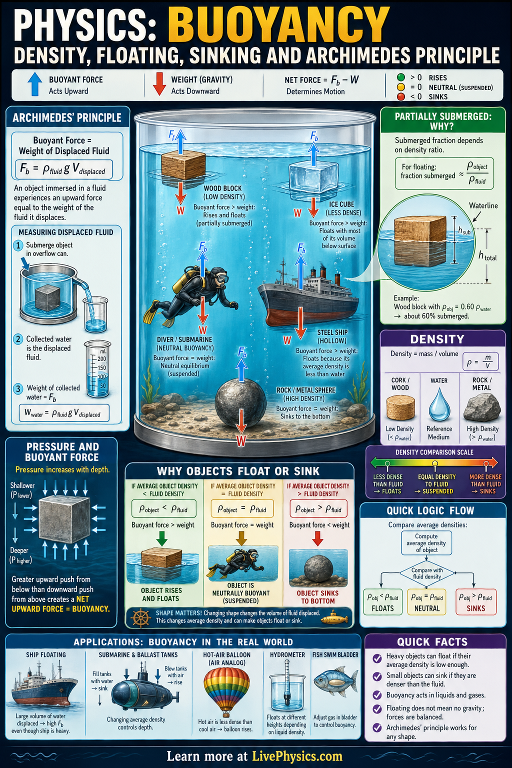 Buoyancy explains why some objects float, some sink, and some stay suspended in a fluid. It connects force, mass, volume, and density in one idea that appears in ships, balloons, submarines, and even the human body in water. Understanding buoyancy helps students predict motion in fluids instead of memorizing separate cases. It also shows how a simple force balance can explain everyday observations.