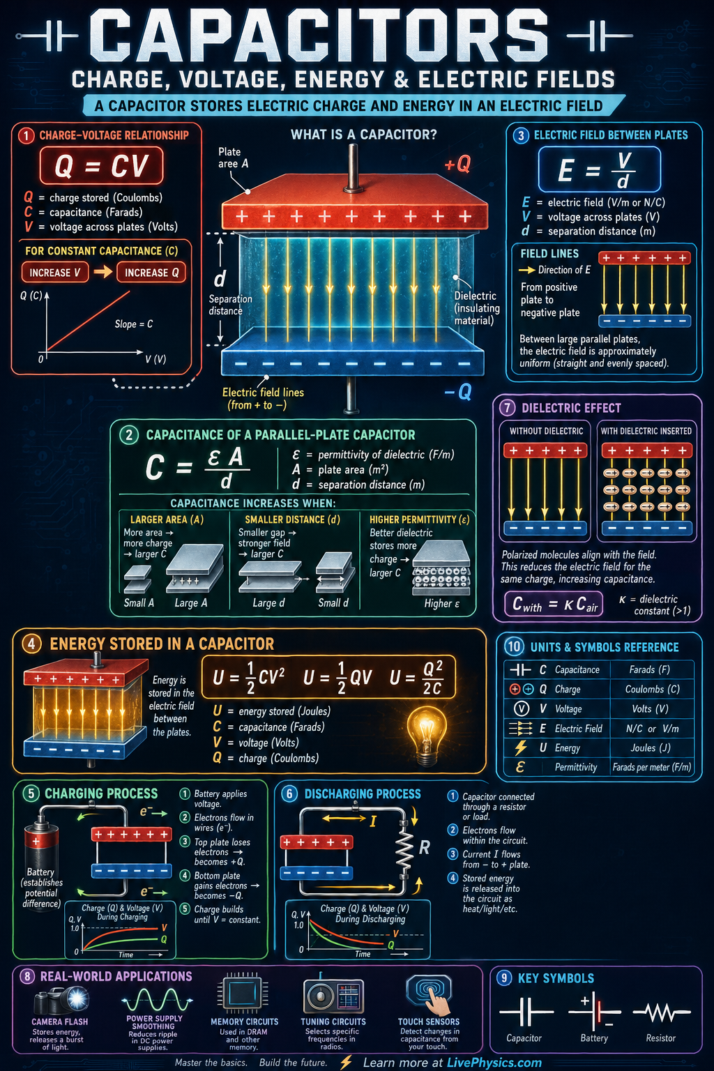 A capacitor is a device that stores electric charge and electric potential energy using two conductors separated by an insulator. It appears in circuits that smooth voltage, store energy briefly, filter signals, and control timing. The basic idea is simple: one plate gains positive charge, the other gains negative charge, and an electric field forms between them. Understanding capacitors helps students connect charge, voltage, energy, and electric fields in one system.