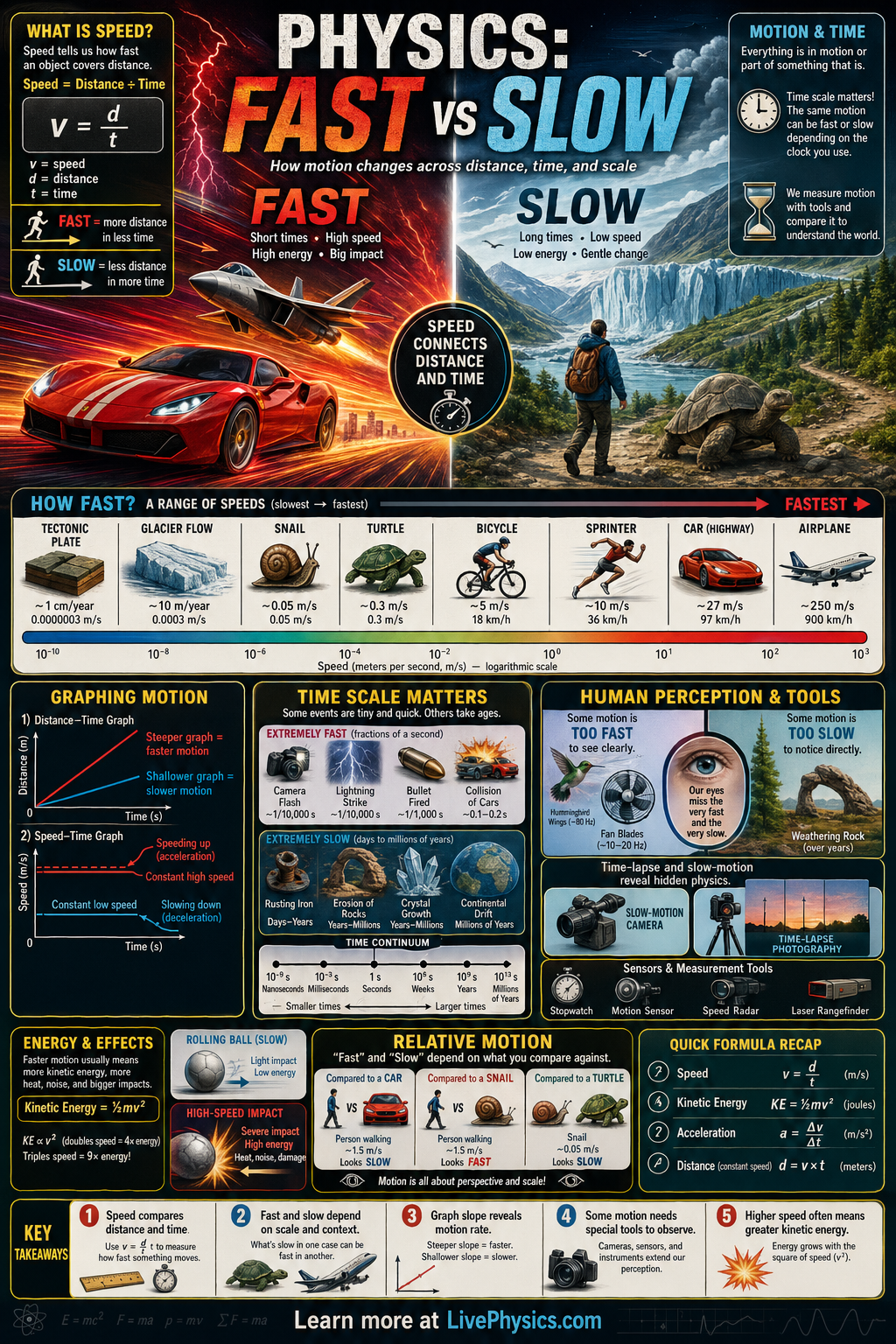 Speed is the rate of change of position, and acceleration tells us how quickly that speed changes. Slow motion often lets us ignore effects like air drag or relativistic changes, while fast motion can make those effects impossible to neglect. In many real systems, increasing speed also greatly increases kinetic energy, since KE = (1/2)mv^2. This is why a small increase in speed can lead to a much larger increase in stopping distance, impact force, or required power.