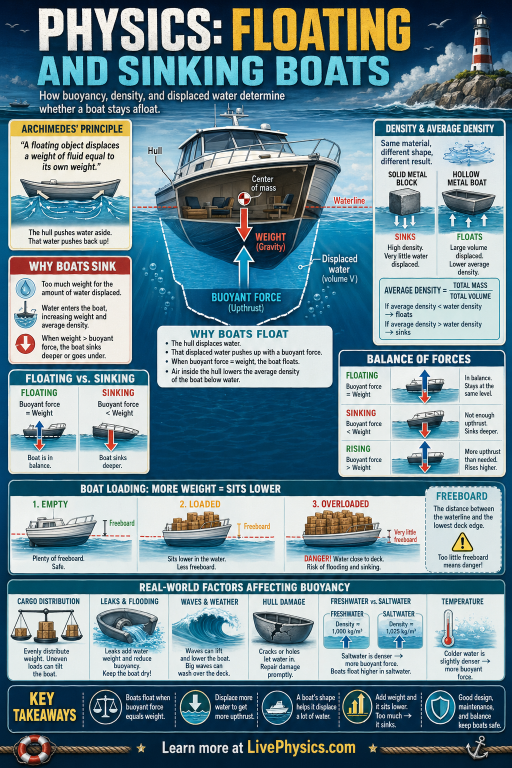 Boats float or sink because of the balance between weight and buoyant force. Weight pulls the boat downward due to gravity, while water pushes upward on the submerged part of the hull. A boat floats when these forces balance, and it sinks when the boat's weight becomes greater than the maximum buoyant force the water can provide. This idea helps explain why massive steel ships can float while a small dense object like a coin sinks.
