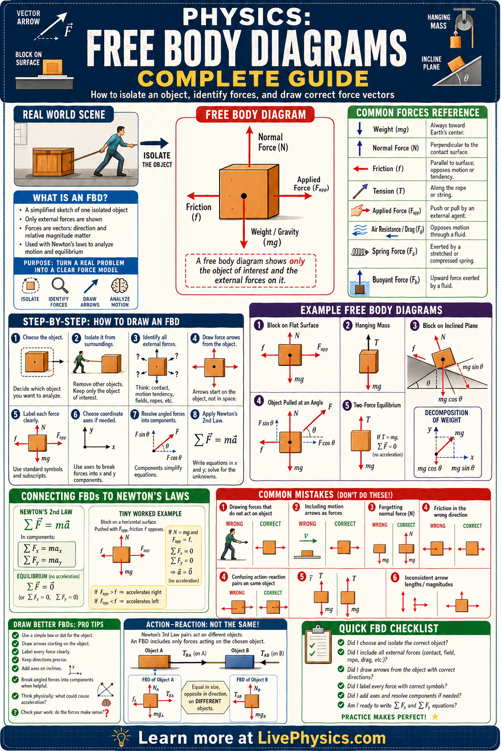 A free body diagram is a simplified drawing that shows one object and all the external forces acting on it. It helps students turn a physical situation into a solvable physics problem. By focusing only on the chosen object, you can apply Newton's laws more clearly and avoid mixing in irrelevant details. Free body diagrams are essential in mechanics, from simple blocks on tables to cars, elevators, and objects on slopes.