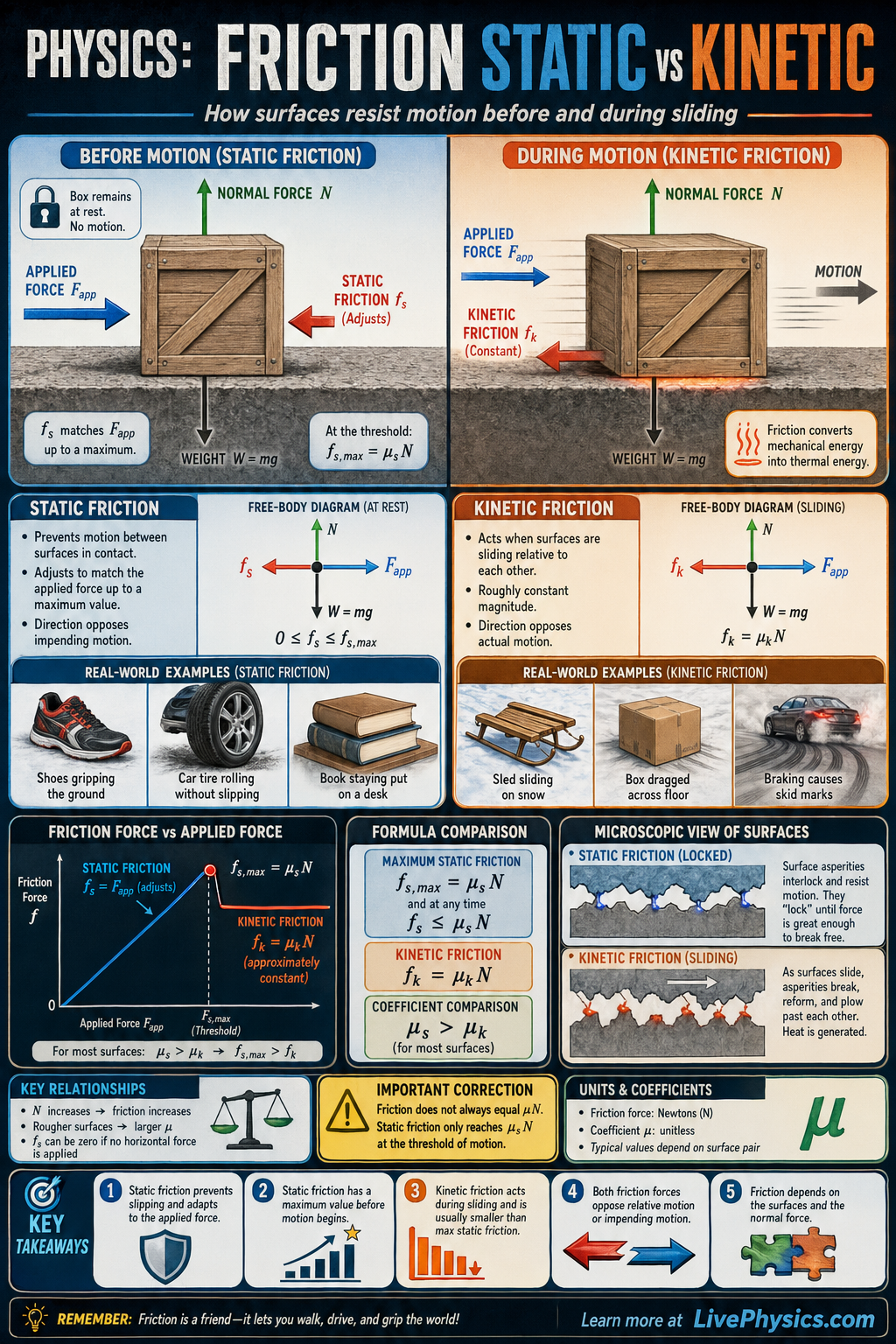 Friction is a contact force that resists motion or attempted motion between surfaces. It matters because it affects everything from walking and driving to machines and sports. Two important types are static friction, which acts when surfaces are not sliding, and kinetic friction, which acts when they are sliding. Understanding the difference helps students predict when objects start moving and how they behave once in motion.