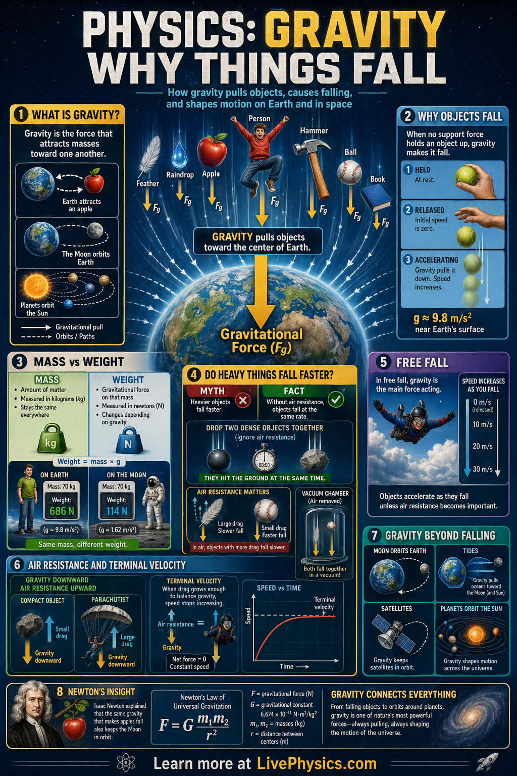 Near Earth's surface, gravity gives most objects the same downward acceleration, about 9.8 m/s^2, if air resistance is small. The gravitational force on an object is its weight, given by F = mg, so heavier objects feel a larger force. However, a larger mass also means more inertia, which is why many objects fall with the same acceleration in a vacuum. Air resistance can change what we observe, making light or spread out objects like feathers fall more slowly in air.