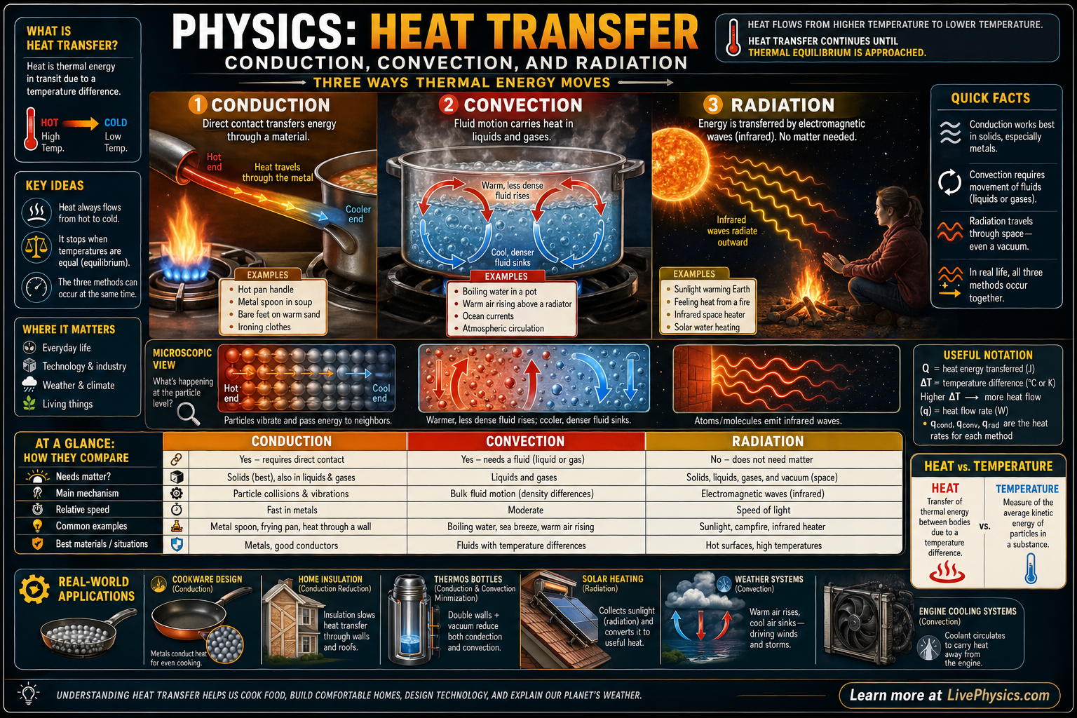 Heat transfer is the movement of thermal energy from a warmer place to a cooler place. It explains why a metal spoon gets hot in soup, why air circulates in a room, and how sunlight warms Earth through space. The three main mechanisms are conduction, convection, and radiation, and each works in a different physical way.