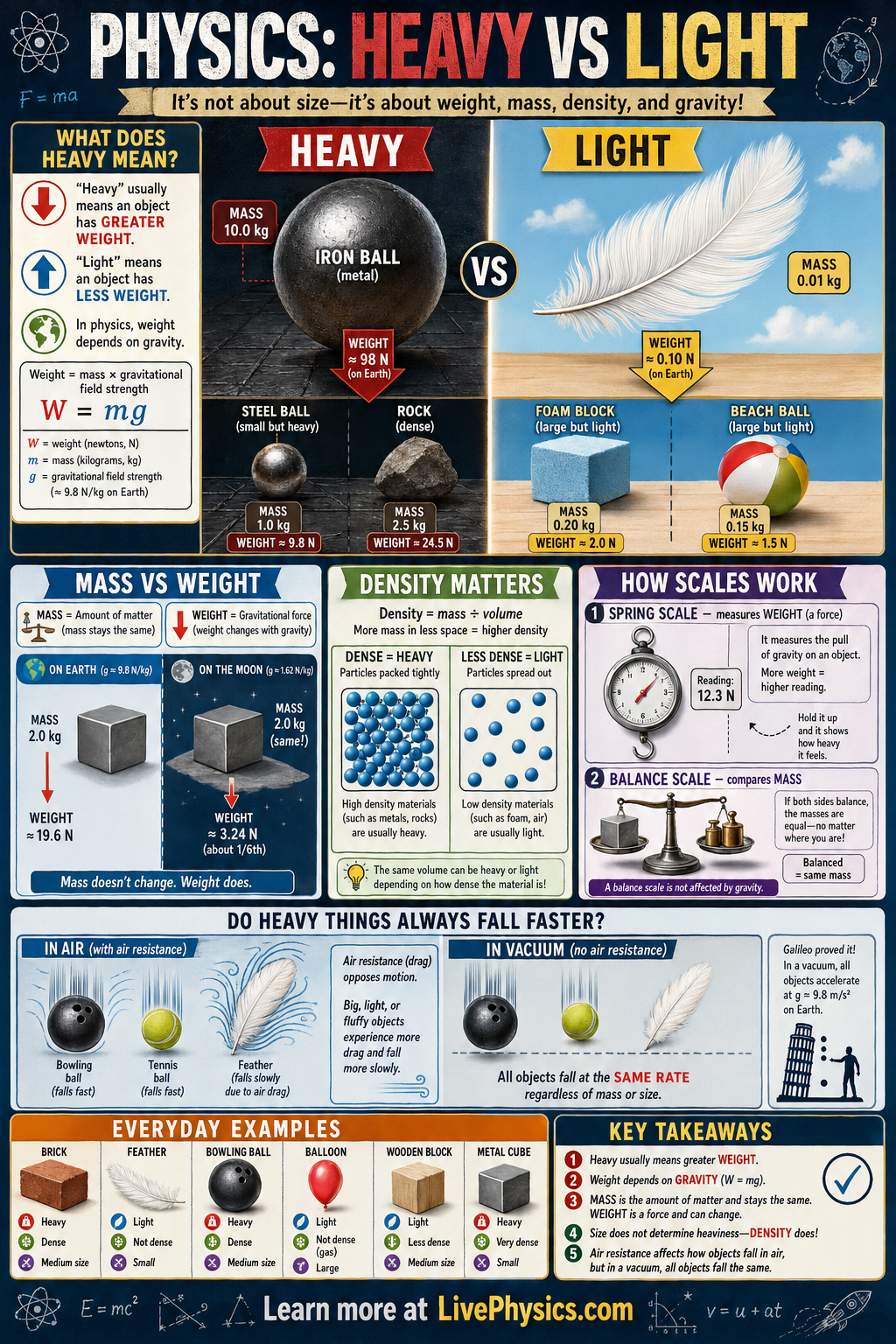 People often use the words heavy and light as if they mean the same thing as big and small, but physics separates these ideas. An object can be small and heavy, like a steel ball, or large and light, like a foam block. Understanding the difference helps students explain motion, floating, lifting, and why objects feel different in your hand. These ideas connect mass, weight, density, volume, and the effects of gravity and air resistance.