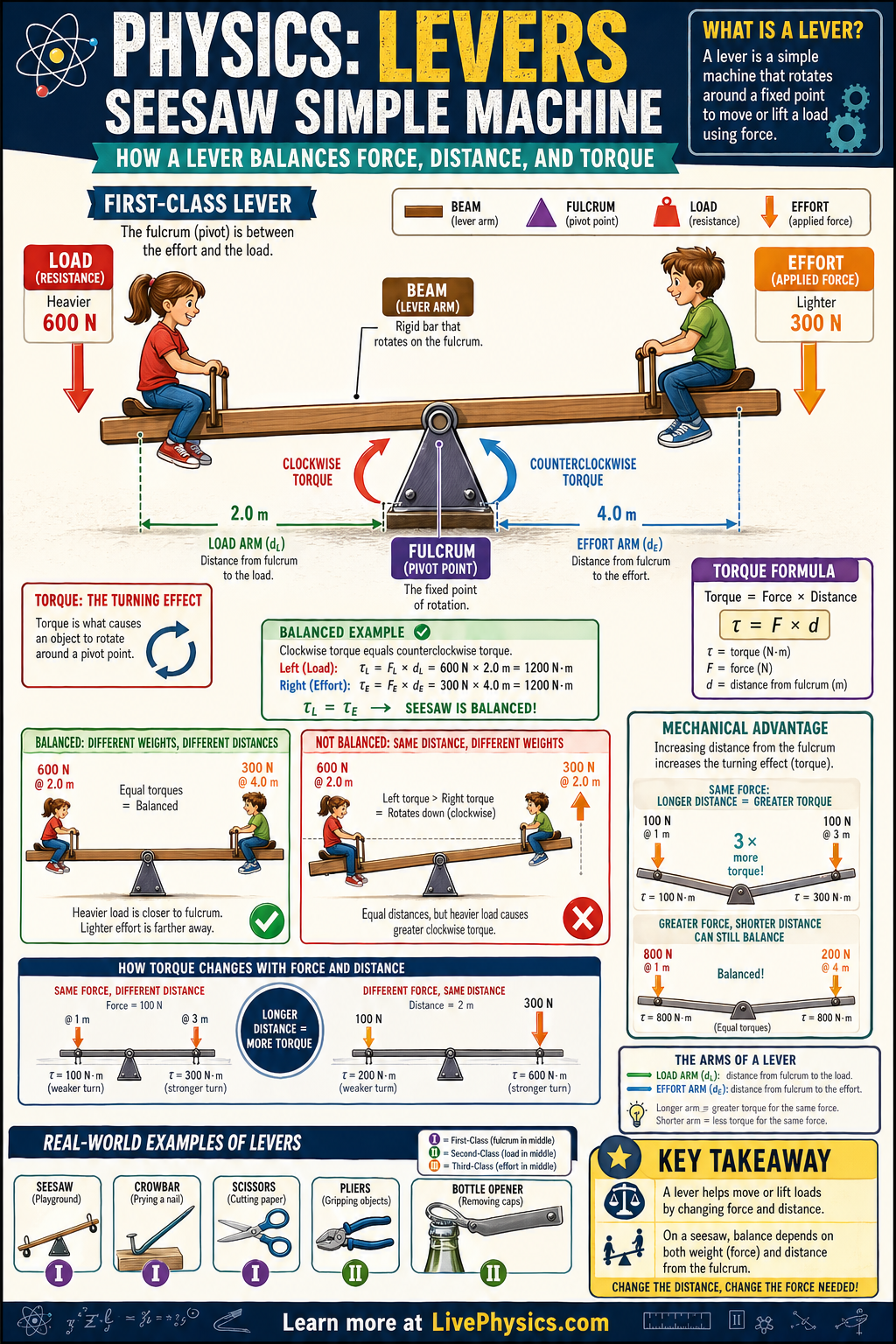A lever is one of the simplest machines, but it can greatly change how much force is needed to lift or balance an object. A seesaw is a classic example of a first class lever because the fulcrum sits between the effort force and the load. Studying levers helps students understand torque, rotational balance, and mechanical advantage. These ideas appear in playground equipment, tools, and many engineering systems.