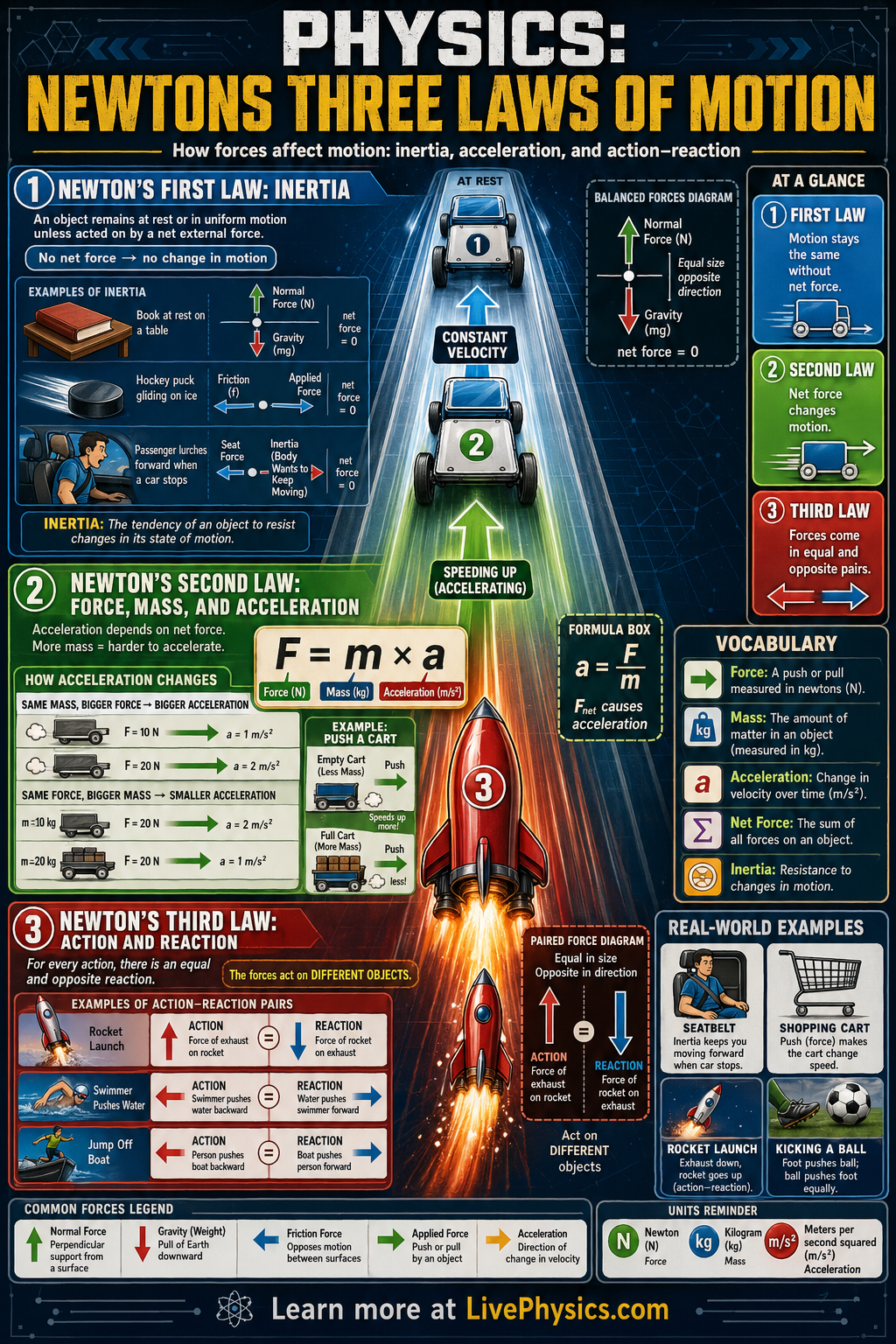 The first law describes inertia, or the tendency of an object to keep its current state of motion unless a net force acts on it. The second law shows how the net force, mass, and acceleration are related through F = ma. The third law explains that forces always come in equal and opposite pairs between interacting objects. Together, these ideas explain motion in vehicles, sports, engineering, and space travel.