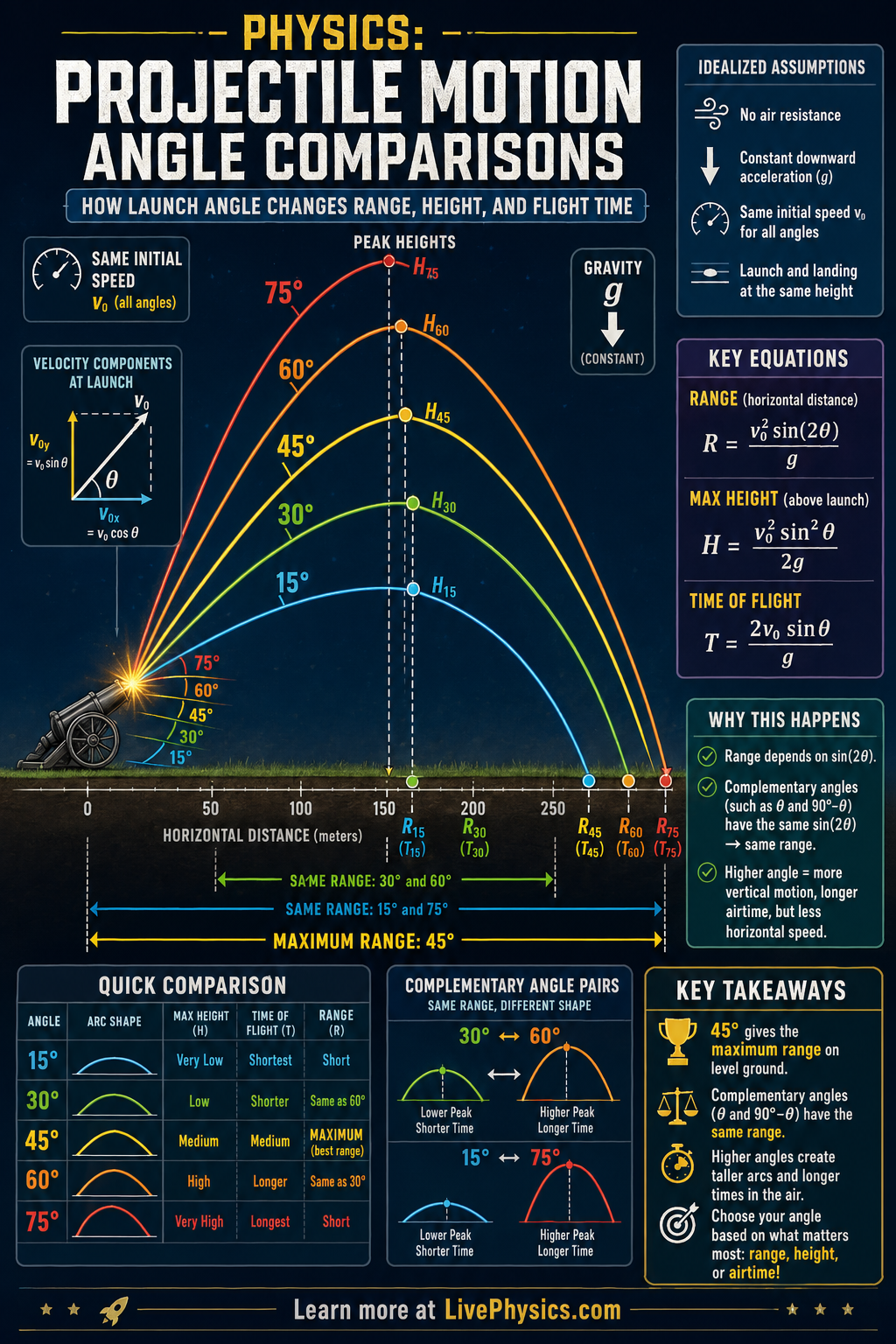 Projectile motion compares how objects travel when launched at different angles with the same starting speed. It matters because the launch angle changes the shape of the path, the time in the air, the maximum height, and the horizontal range. These comparisons appear in sports, engineering, and basic motion planning. Studying several angles side by side helps students see the tradeoffs clearly.