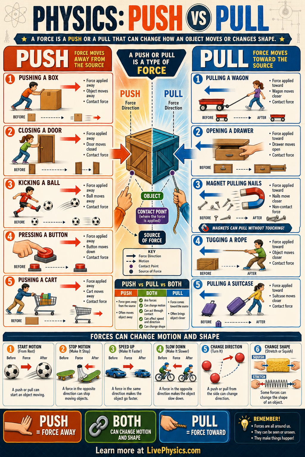 A push and a pull are both forces, which means they can change how an object moves or even change its shape. In everyday life, you push a door to open it away from you and pull a drawer to slide it toward you. Learning the difference helps students describe motion clearly and understand how forces act in real situations. This idea is a foundation for later topics such as Newton's laws, friction, and balanced versus unbalanced forces.