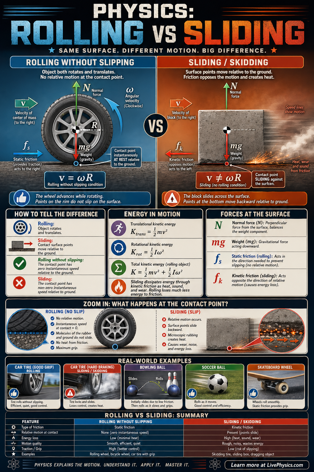 In rolling without slipping, translation and rotation are linked by the condition v = rω, where v is the center of mass speed, r is radius, and ω is angular speed. The contact point has zero speed relative to the ground at that instant, so static friction may act without necessarily doing dissipative work. In sliding, kinetic friction acts at the contact surface and usually opposes the relative motion there, producing a force f_k = μ_kN. Real objects can switch between sliding and rolling as friction changes both their linear and rotational motion.