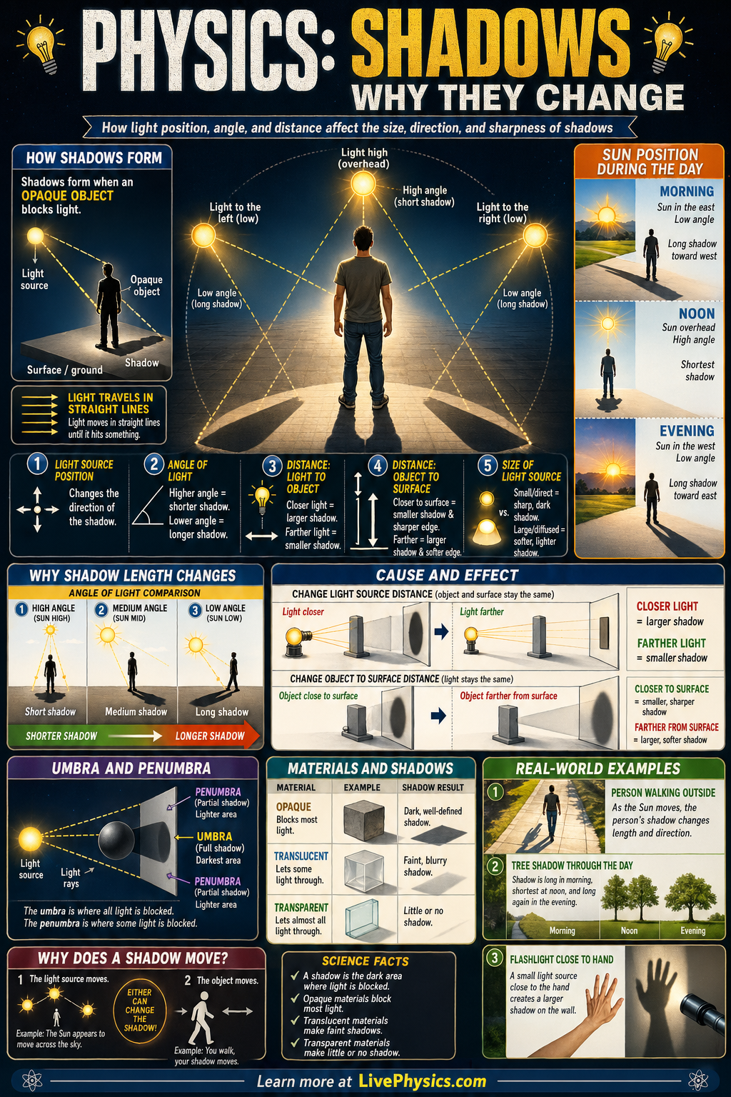 Shadows change when the light source moves, when the object moves, or when the distance between the light, object, and surface changes. A light source that is low in the sky makes a long shadow, while a higher light source makes a shorter one. A nearby light bulb can create a larger, blurrier shadow than a distant light source. These changes happen because light usually travels in straight lines, so different angles and distances change which rays are blocked.